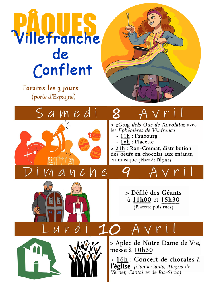 Samedi : matin et après-midi, goigs dels ous de xocolata, récolte des oeufs de chocolat contre de la musique / soir, "ron-cremat", rhum flambé aux épices et grains de café, en musique et distribution de la récolte des oeufs aux enfants