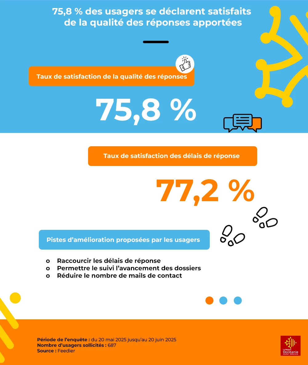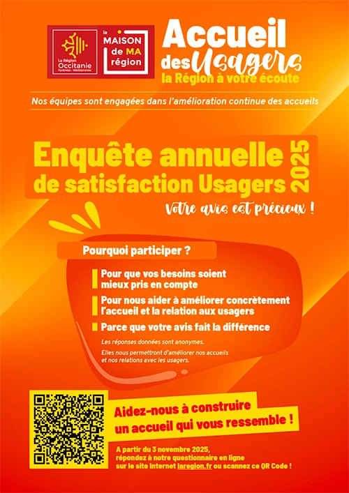 Nous avons récemment mené une enquête de satisfaction afin de mieux comprendre vos attentes. Merci à toutes et tous pour vos retours à la suite de votre échange avec les services de la Région Occitanie. Soyez assurés que chaque contribution sera prise en compte avec attention, et que les pistes d’amélioration seront traitées par nos équipes.