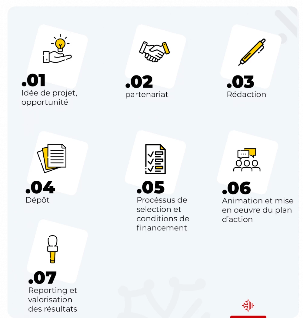 1. Idée de projet, opportunité, 2. partenariat, 3. rédaction, 4. dépôt, 5. processus de sélection et conditions de financement, 6. animation et mise en œuvre du plan d’actions, 7. reporting et valorisation des résultats