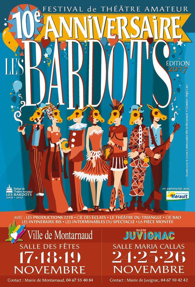La Municipalité de Montarnaud vous présente la 10e édition du Festival de théâtre amateur « Les Bardots », qui relance son partenariat avec la Municipalité de Juvignac, sur deux week-ends consécutifs : à la salle des fêtes de Montarnaud du 17 au 19 novembre et à la salle Maria Callas de Juvignac du 24 au 26 novembre.