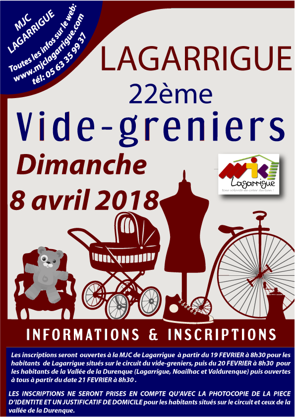La MJC de Lagarrigue organise son traditionnel vide-greniers dans les rues de Lagarrigue, le dimanche 8 avril 2018. Environs 320 exposants . Restauration et buvettes sur place.