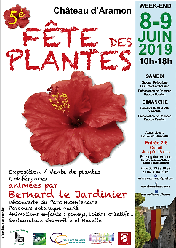Samedi 8 & dimanche 9 juin 2019, l’association des Amis du Château d’Aramon organise sa "5ème Fête des Plantes du Château d’Aramon" dans les jardins et le parc méditerranéen classés du château d’Aramon gracieusement mis à disposition par le Marquis et la Marquise D’ARAMON. Animée intégralement par Bernard PICAL dit "Bernard le jardinier", elle réunira une cinquantaine d’exposants qui proposeront leurs produits haut de gamme à quelques 2 000 jardiniers amateurs en quête de la plante ou du décor de leur rêve.