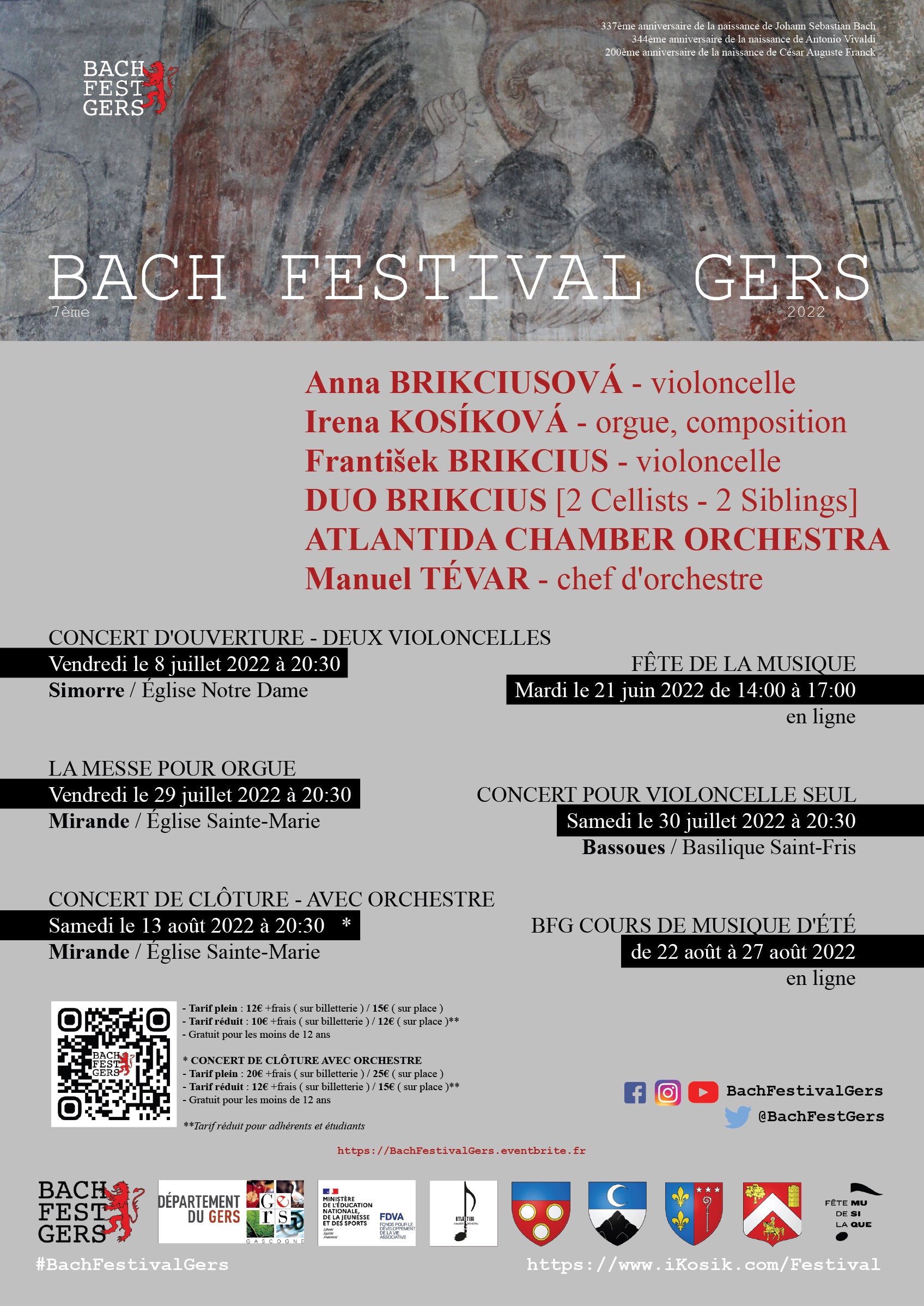 Vous êtes cordialement invités aux concerts du 7ème cycle BACH FESTIVAL GERS 2022 ( juin - août ), lesquels se déroulent dans le département du Gers, Occitanie, France ( CONCERT D’OUVERTURE - DEUX VIOLONCELLES à Simorre - 8 juillet / LA MESSE POUR ORGUE à Mirande - 29 juillet / CONCERT POUR VIOLONCELLE SEUL à Bassoues - 30 juillet / CONCERT DE CLÔTURE AVEC ORCHESTRE à Mirande - 13 août ).