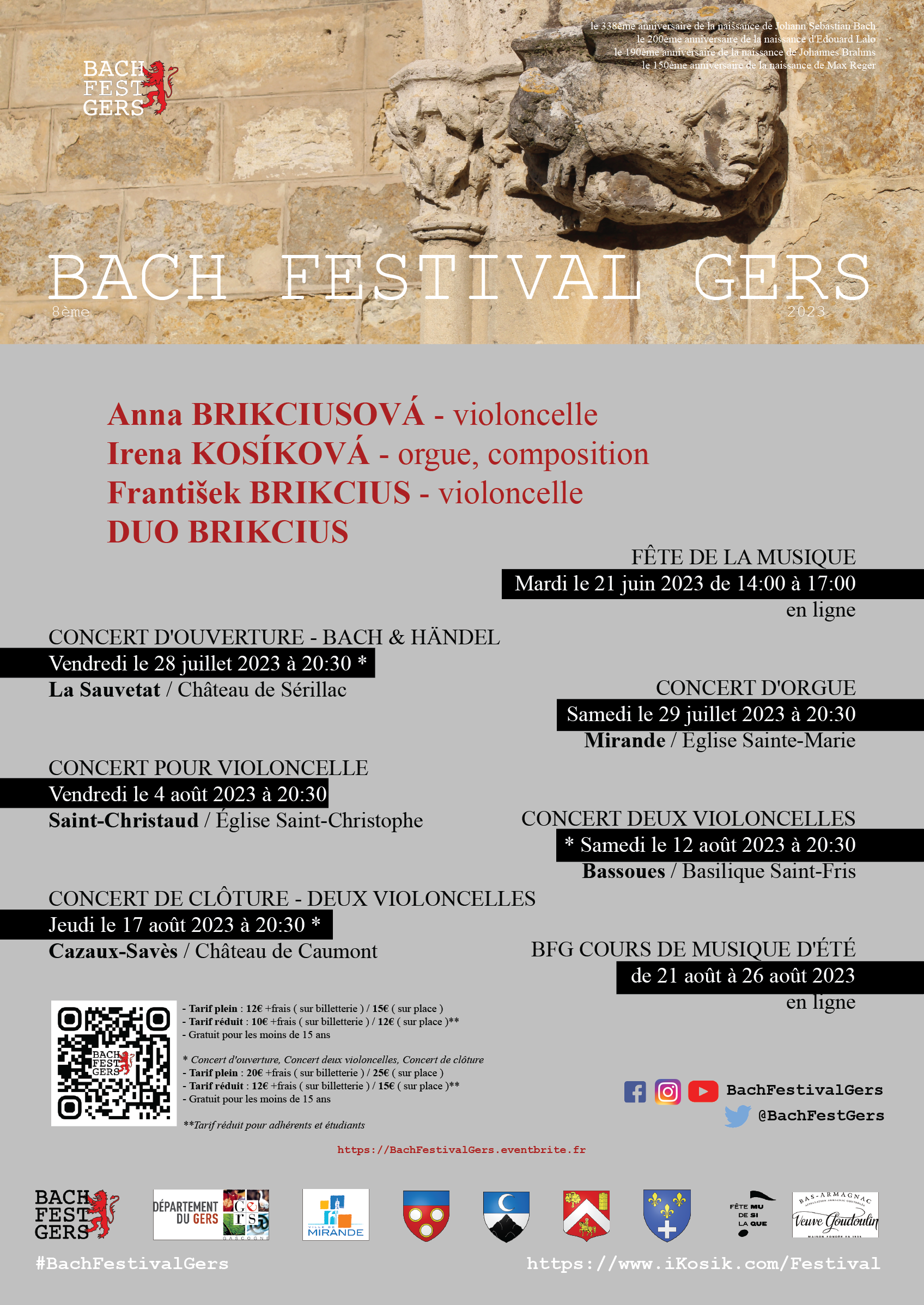 Vous êtes cordialement invités aux concerts du 8ème cycle BACH FESTIVAL GERS 2023 ( juin - août ), lesquels se déroulent dans le département du Gers, Occitanie, France ( CONCERT D’OUVERTURE - BACH & HÄNDEL au Château Serillac - 28 juillet / CONCERT D’ORGUE à Mirande - 29 juillet / CONCERT POUR VIOLONCELLE SEUL à Saint-Christaud - 4 août / CONCERT DEUX VIOLONCELLES à Bassoues - 12 août / CONCERT DE CLÔTURE AVEC DUO BRIKCIUS au Château Caumont - 17 août ).