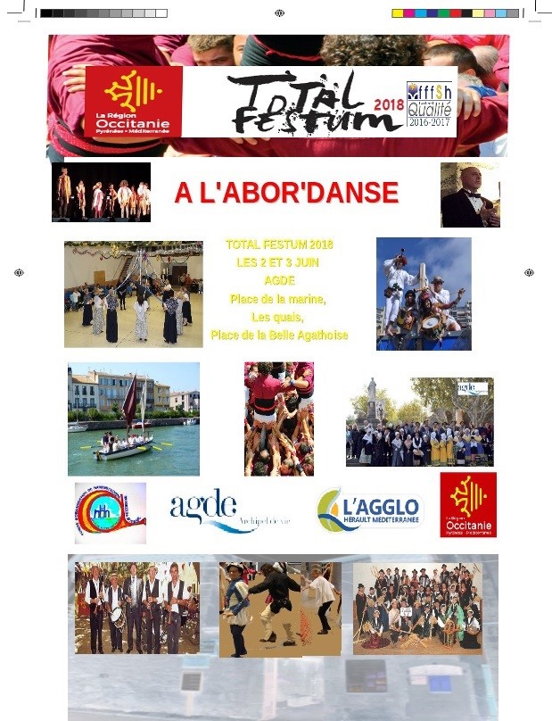 Dans le cadre de Total FESTUM la ville d AGDE à travers les Associations COMHA et EUROTAMBFI, organise deux jours d animations liés aux traditions maritimes et à la culture occitane. Les samedi 2 et dimanche 3 juin, sur la place et les quais de la Marine, ainsi qu’à la place de la Belle Agathoise.