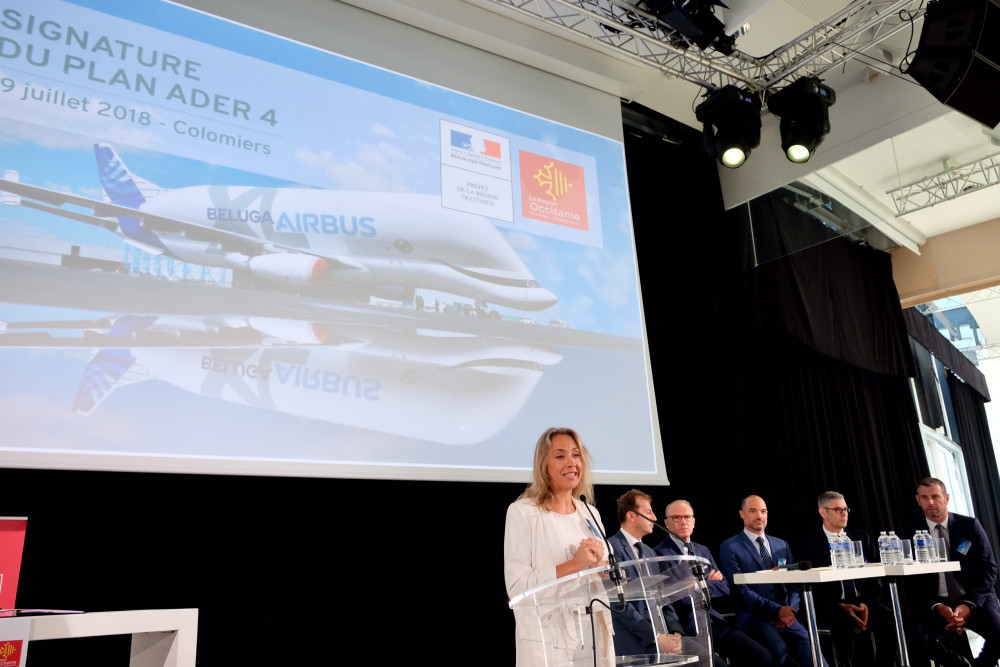 La Région Occitanie / Pyrénées-Méditerranée a profité de ce premier vol pour signer avec l’Etat le Plan « ADER 4 » (Actions pour le Développement des Entreprises Régionales de sous-traitance - en hommage au pionnier de l’aviation, le Murétois Clément Ader). Nadia Pellefigue, Vice-Présidente de Région en charge du développement économique et de la recherche, en a présenté les grands axes, en présence du préfet de région et du président d’Airbus Commercial Aircraft.