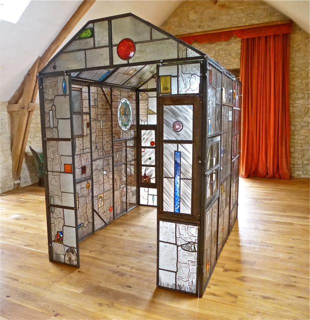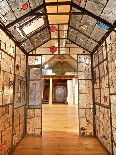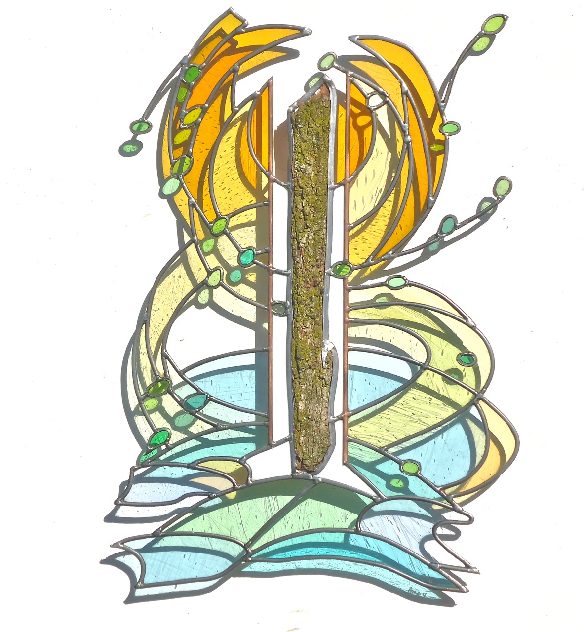 La Main. Les nombreuses techniques que j’utilise restent fidèles à la fabrication traditionnelle du vitrail : coupe du verre et peinture, fusing, sablage, gravure à l’acide et thermoformage.