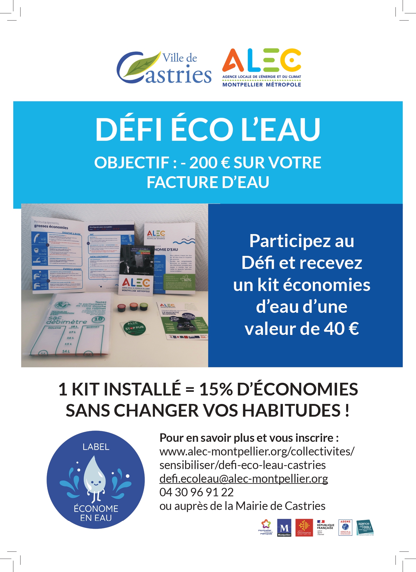 Vous participez ou vous souhaitez participer au Défi Eco l’Eau organisé par l’ALEC et Castries ? Cet atelier vous est destiné ! Vous y apprendrez à installer le matériel hydro-économe fourni et les bons gestes pour réaliser des économies tout au long de l’année.