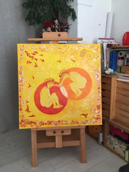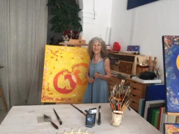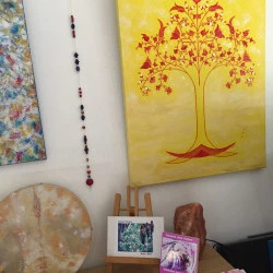 D’Univers en Univers , de dimensions en dimensions, chaque symbole posé sur mes toiles invite au rêve et à la joie .