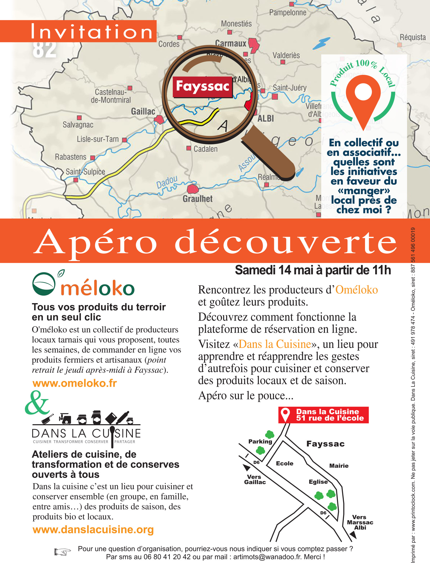Les deux associations “O’méloko” et “Dans la cuisine” vous invitent à un apéro convivial mêlant partage et dégustation, le samedi 14 mai à partir de 11h à Fayssac.