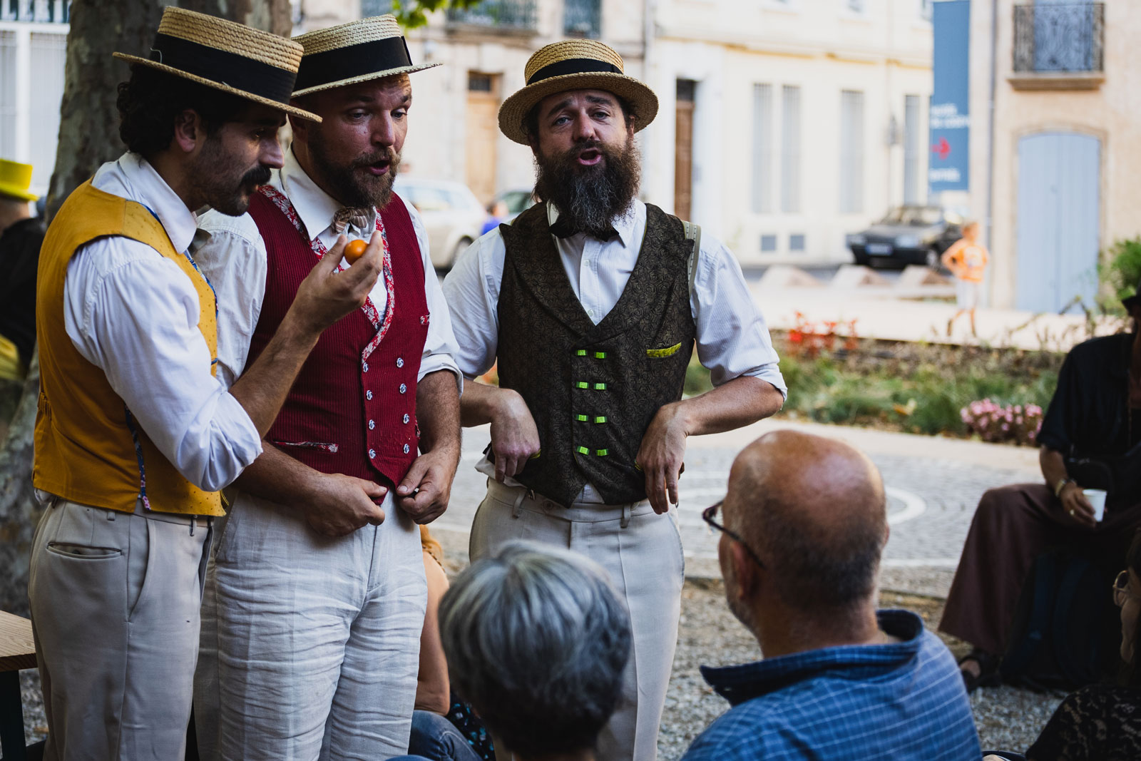 Le trio vocal Aqueles s’empare des chansons de villages languedociens au temps dit de « la belle époque ». En costume du dimanche et canotier, ils interprètent ces airs leurs insufflant une vie nouvelle. Et de la vie, il y en a dans ces petites histoires chantées. De l’Amour, des fleurs, de la vigne et du vin, des promenades à bicyclette et le repas du dimanche au Mazet. Mais aussi de l’argent mal gagné, des cocus, et la guerre aux Amériques…. C’est tout l’imaginaire languedocien de l’entre deux