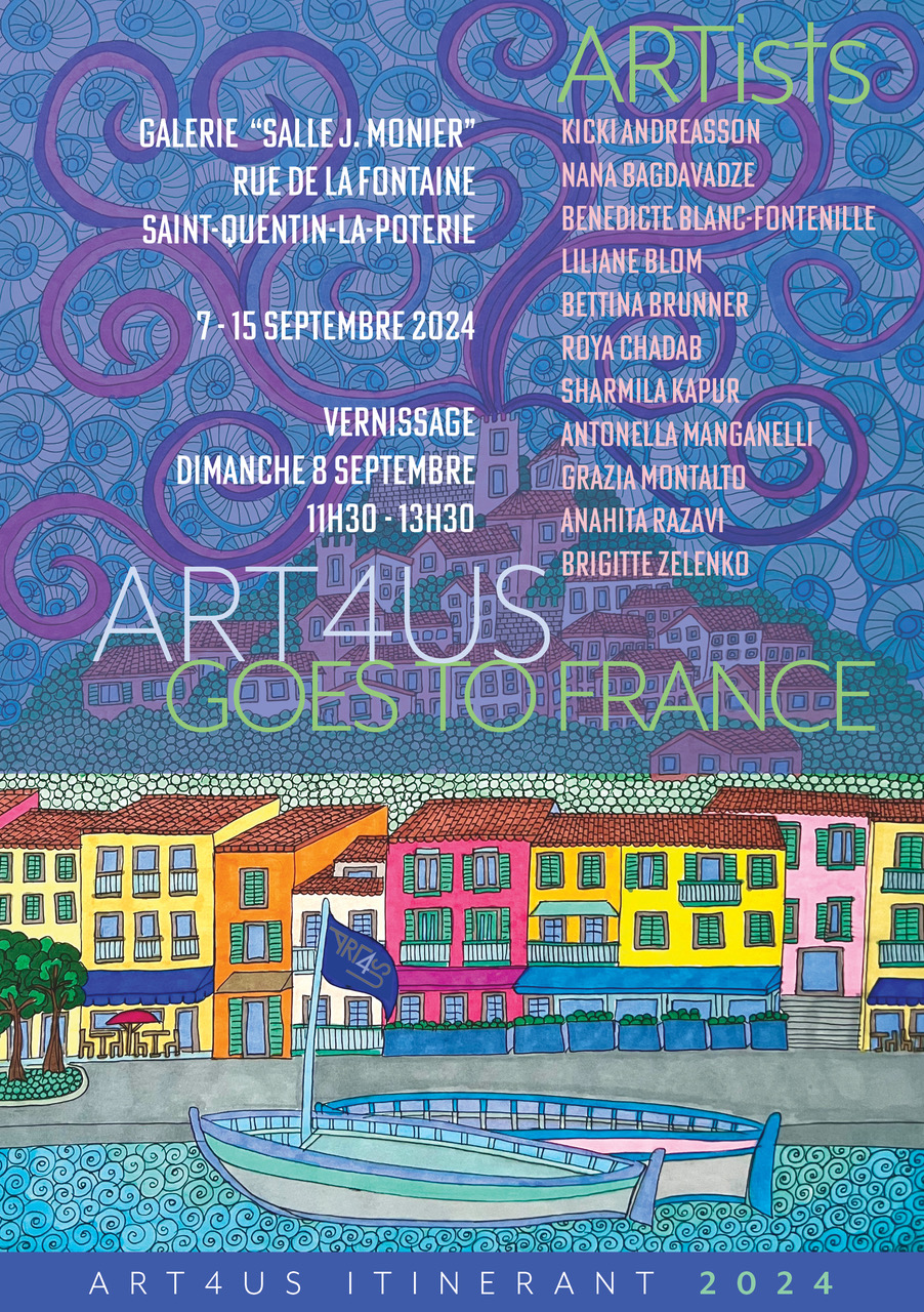 ART4US, au-delà des expositions, est un lieu d’échanges et de collaboration où les artistes, designers, écrivains… peuvent discuter de leurs disciplines respectives : peinture, dessin, gravure, photographie, sculpture, joaillerie, art du textile….