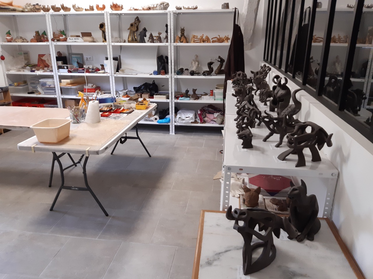 Un espace d’exposition est placé à côté de la porte de l’atelier et dans l’atelier même pour les pièces fragiles. Le four de céramique se situe aussi à ce niveau