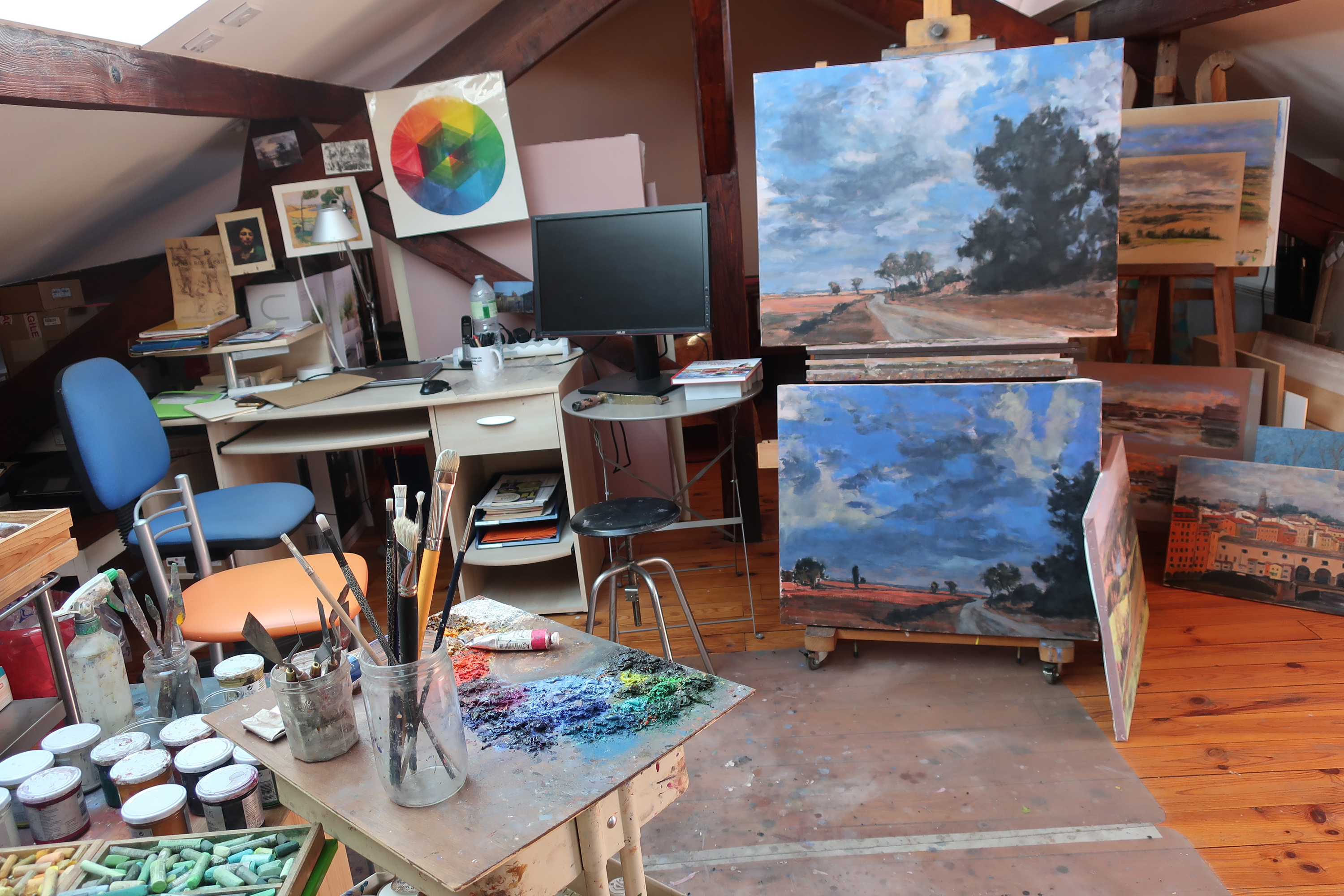 Elle réalise des croquis ainsi que des clichés qui vont constituer une base qu’elle utilisera pour son travail en atelier. Là commence le temps de la réflexion avant de passer à l’acte de peindre.