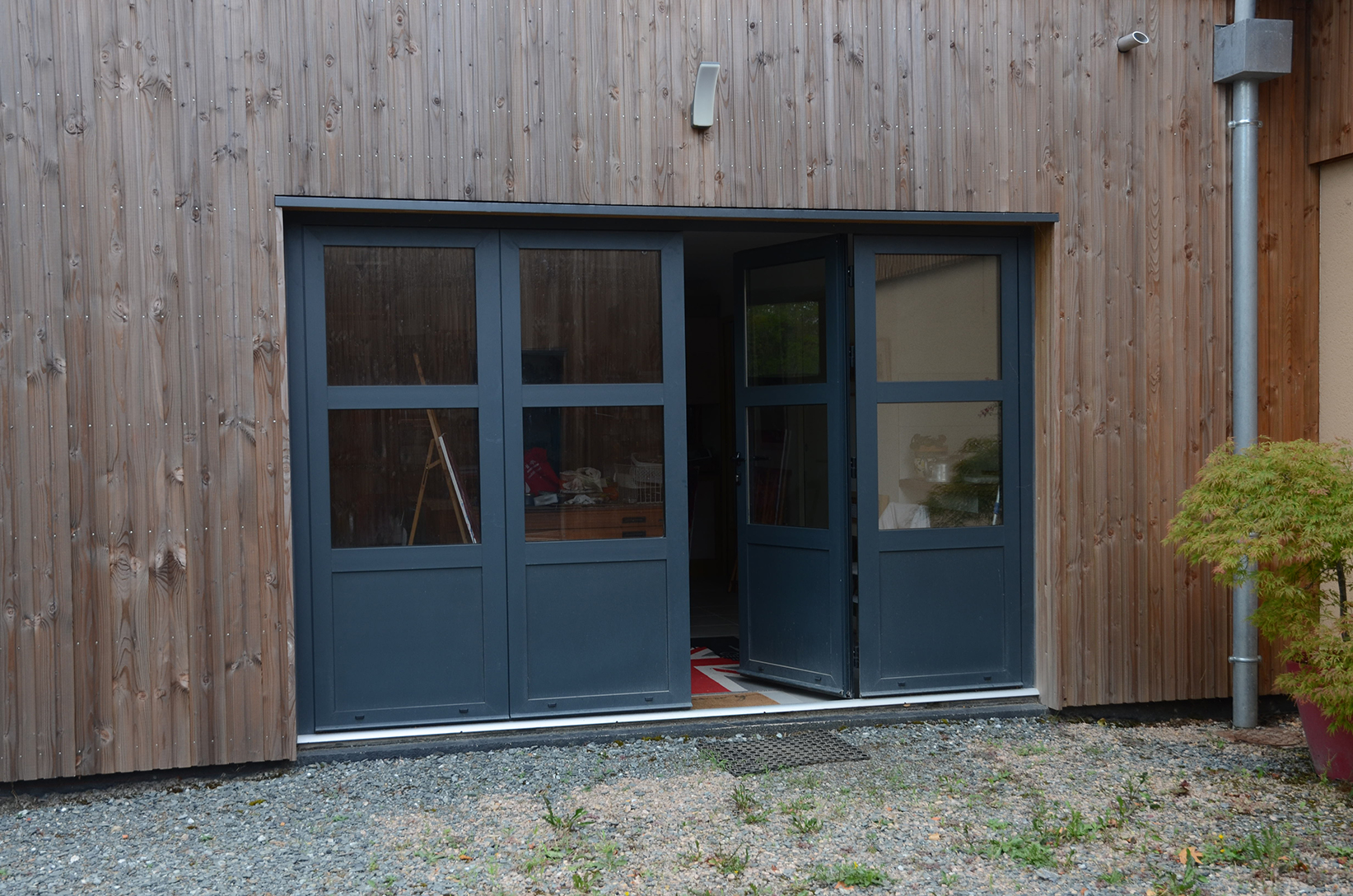 Atelier attenant à ma maison, surface de 20 m2, portes vitrées orientées vers le nord, carrelage recouvert en partie de tapis