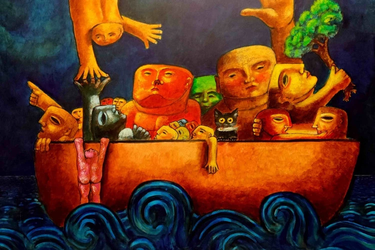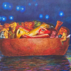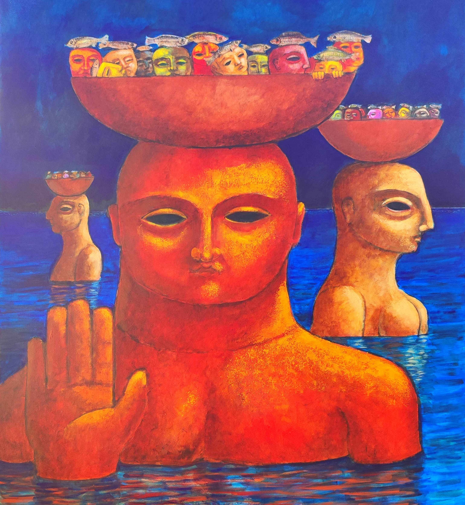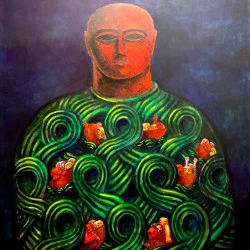 Il peint des personnages contemporains venus des fonds des âges . Ils sont massifs , sculpturaux, baignés dans une lumière chaude contrastée de clairs-obscurs. Leurs yeux sont évidés et sombres mais ne sont pas dépourvus de regard. Leurs corps et leurs positions traduisent leurs états d’âme .