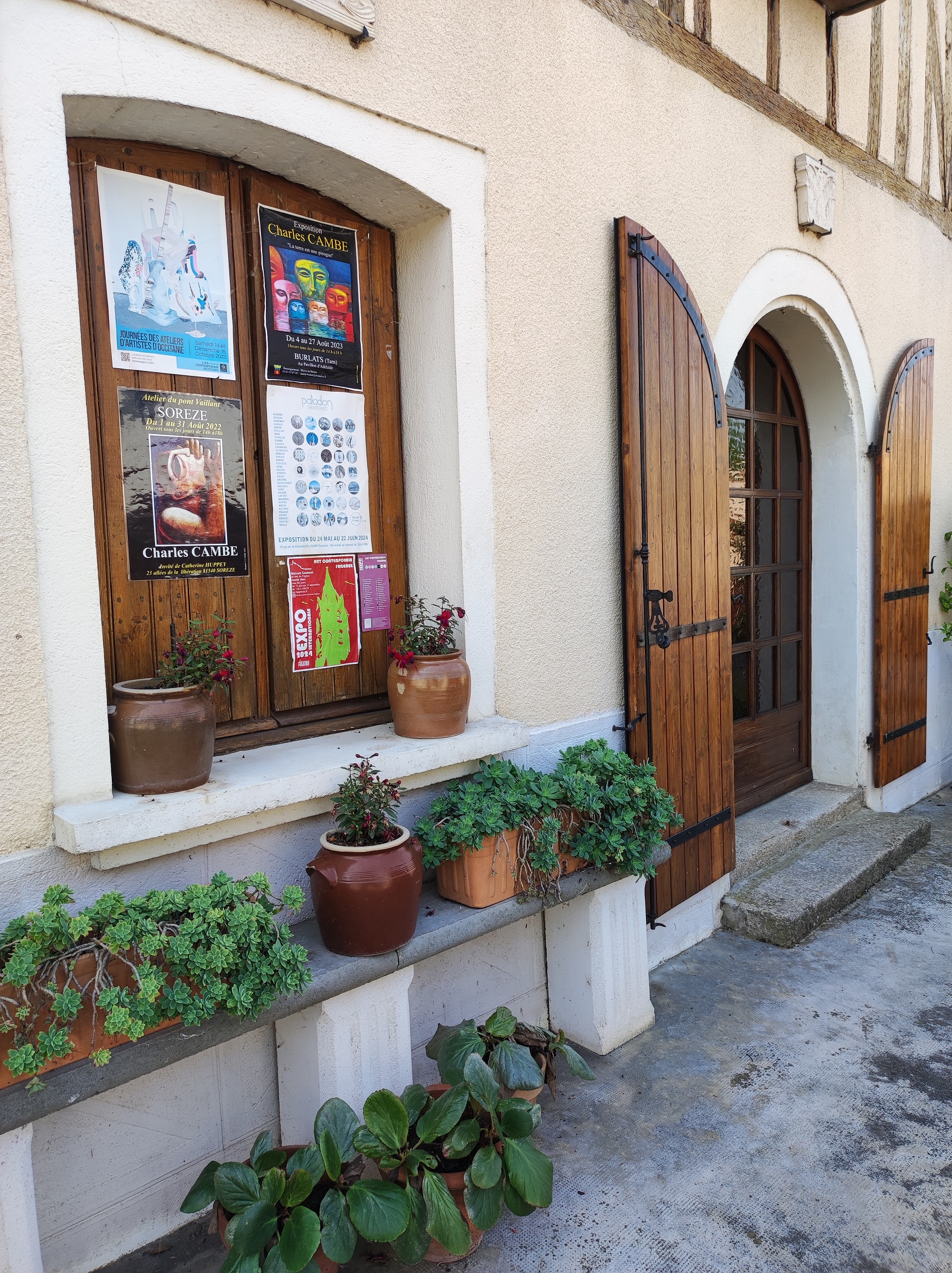 Le bâtiment à pans de bois date de 1697 ,chargé d’histoire ,le lieu a été l’ancien café du village. La première pièce dite salle du bar sert de galerie d’exposition .. Sur l’arrière deux marches amènent à une grande pièce dite salle des banquets elle sert d’atelier et de réserves .