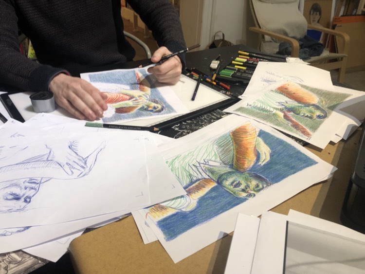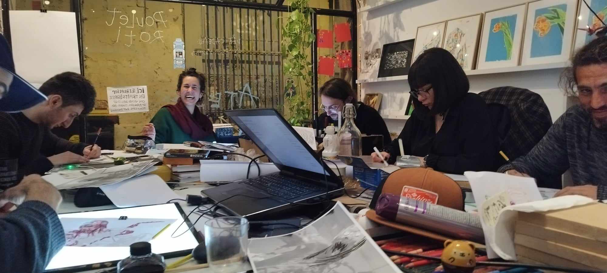 Nous y faisons de l’illustration, de la BD, de la peinture, du tissage, de la céramique sculpturale, un peu de musique et beaucoup de café-filtre.