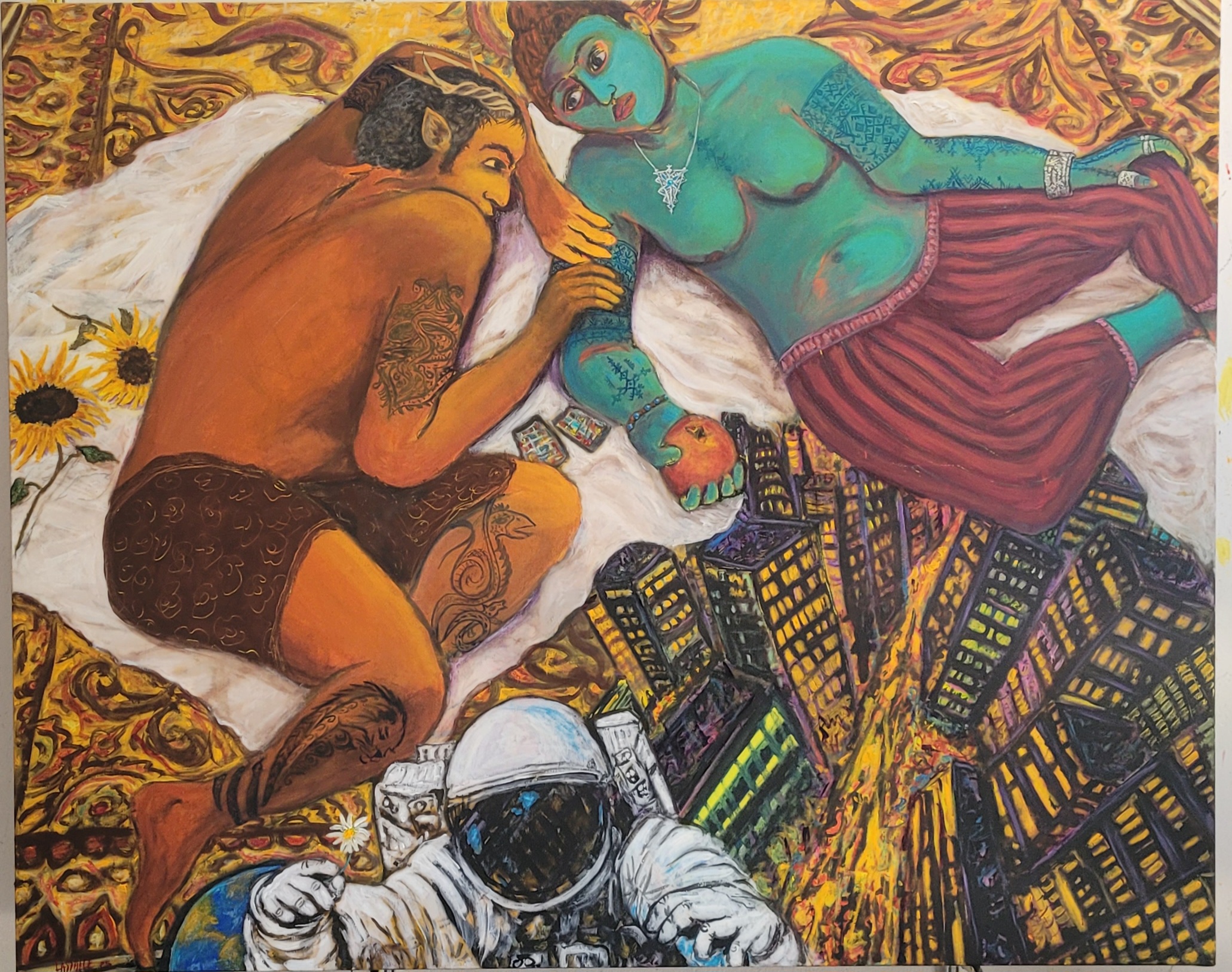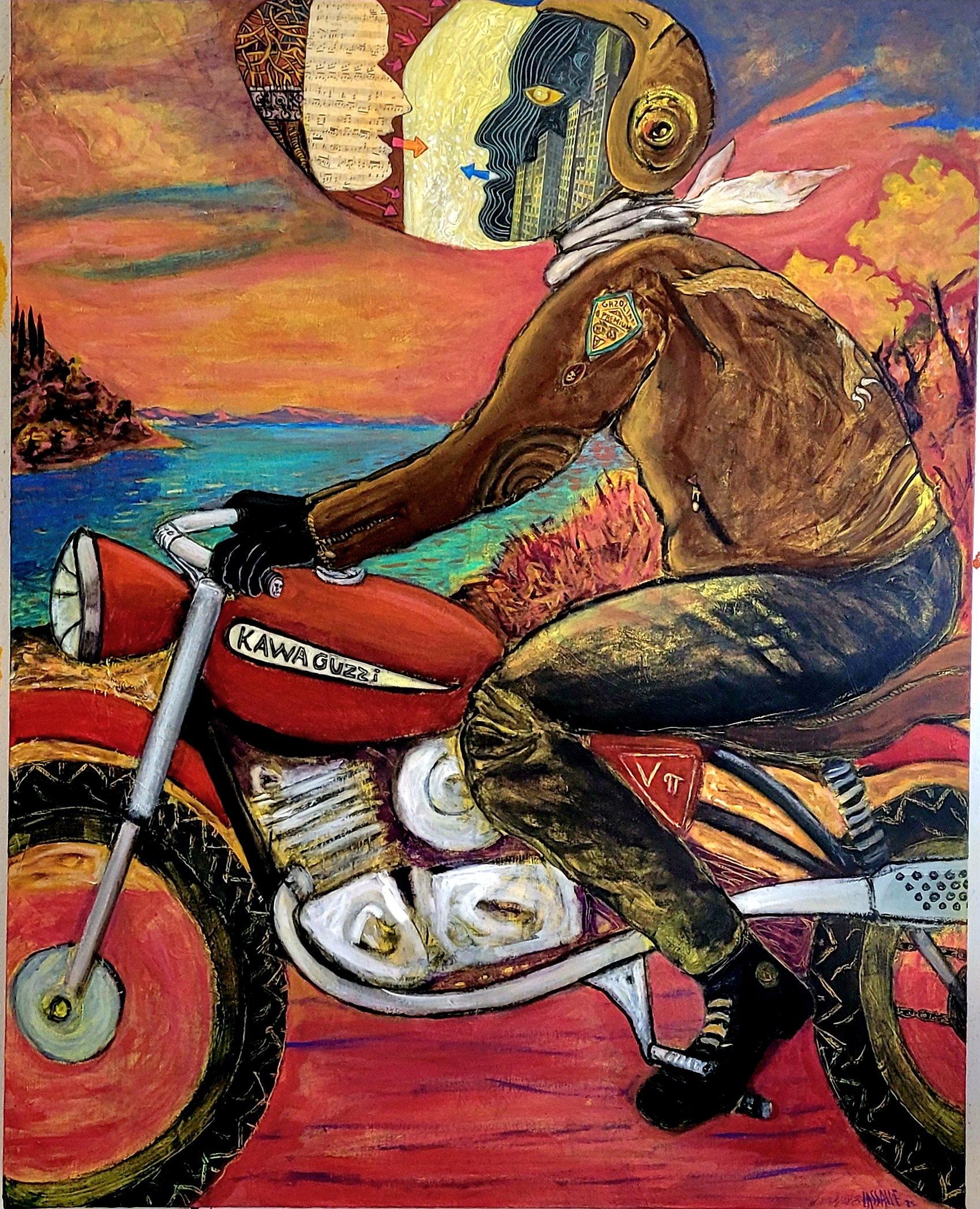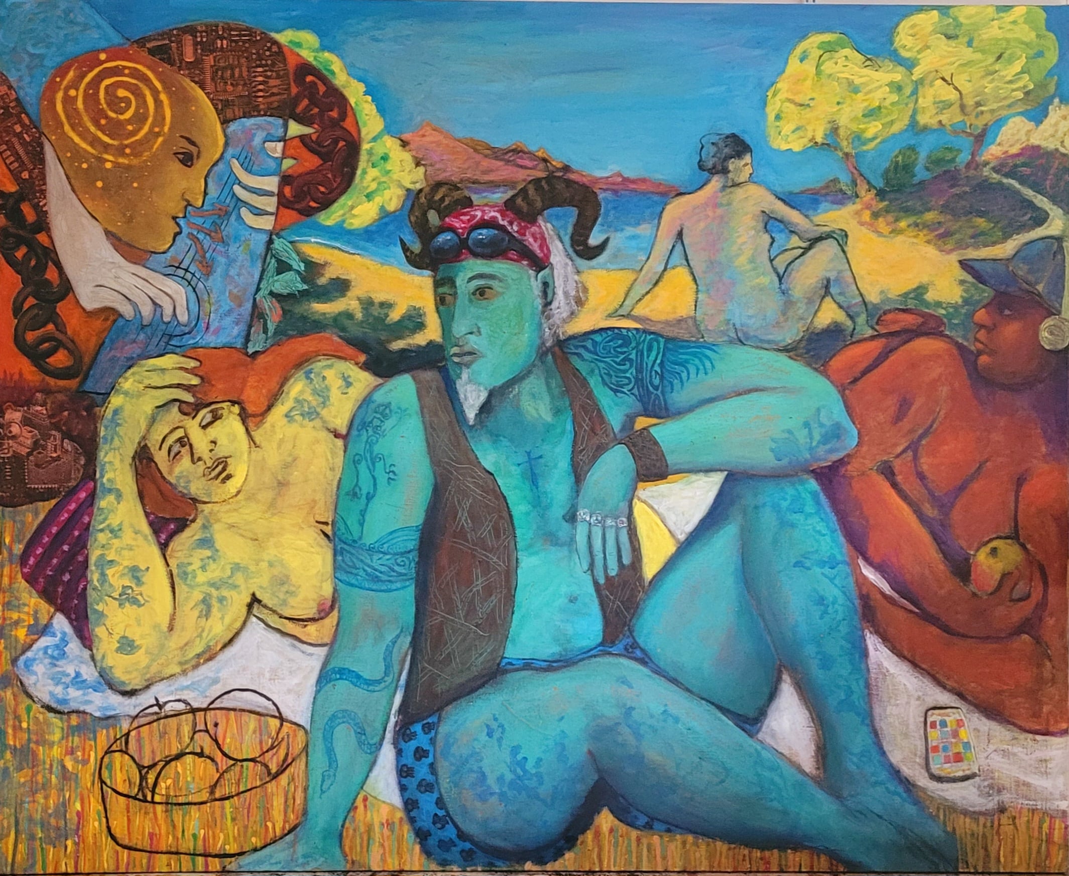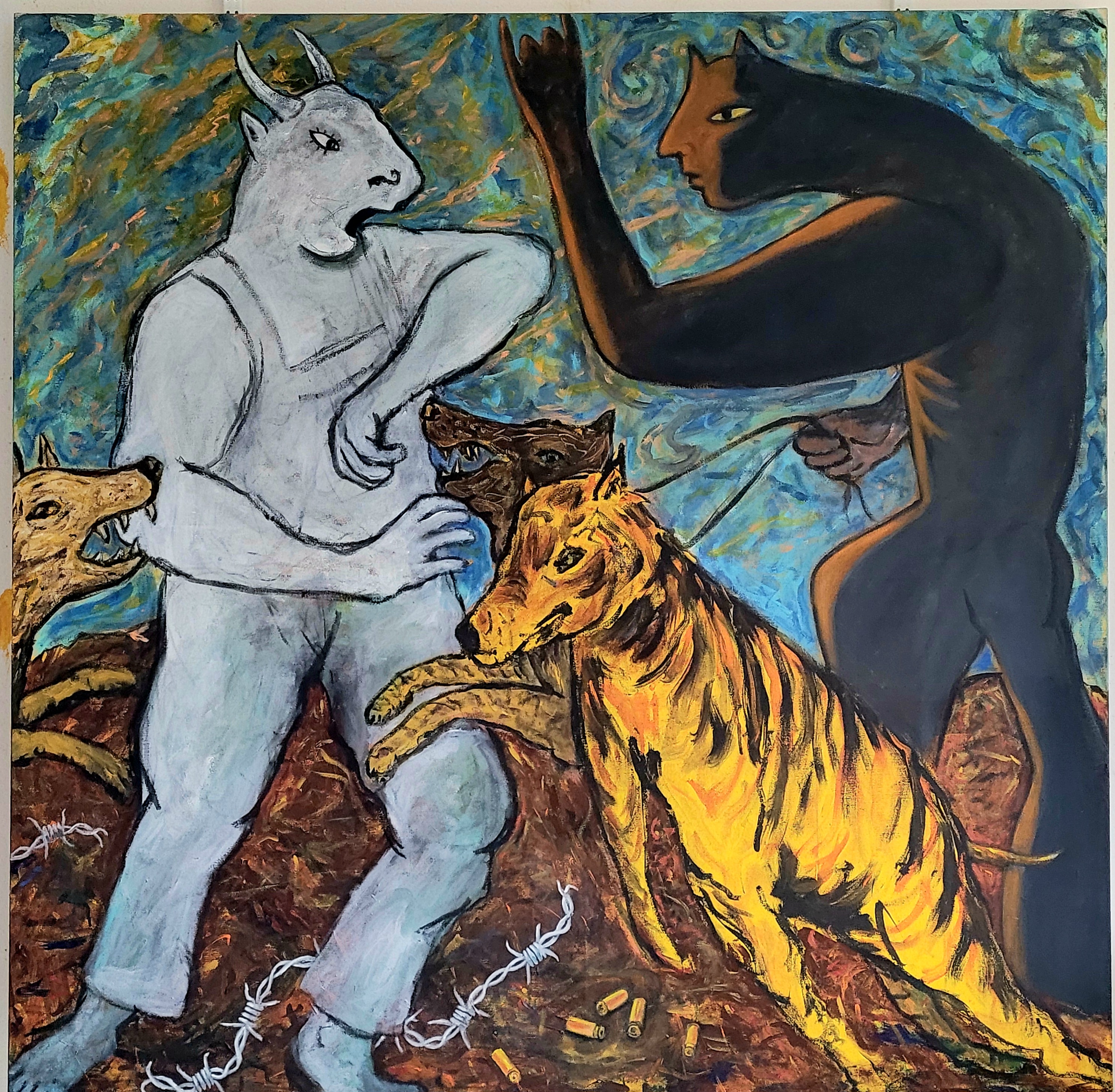 Bruno Lassalle propose une peinture vibrante et symbolique où se croisent des influences variées, allant du surréalisme à l’expressionnisme. Par la fusion des styles et des époques, ses tableaux, chargés de symboles et d’émotions, interrogent les relations humaines, les tensions sociales, et le poids de l’histoire sur la société contemporaine. Chaque personnage, souvent empreint de traits fantastiques ou mythologiques, porte une narration personnelle qui reflète des questionnements plus vastes sur l’identité, la lutte et la résilience. Bruno Lassalle puise aussi dans des références culturelles modernes comme le hip-hop ou le steampunk, pour ancrer son travail dans la contemporanéité, tout en dialoguant avec le passé. Il utilise un langage pictural à la fois coloré et expressif, où la distorsion des formes accentue l’intensité émotionnelle des scènes, créant ainsi une peinture qui transcende le temps et les genres.