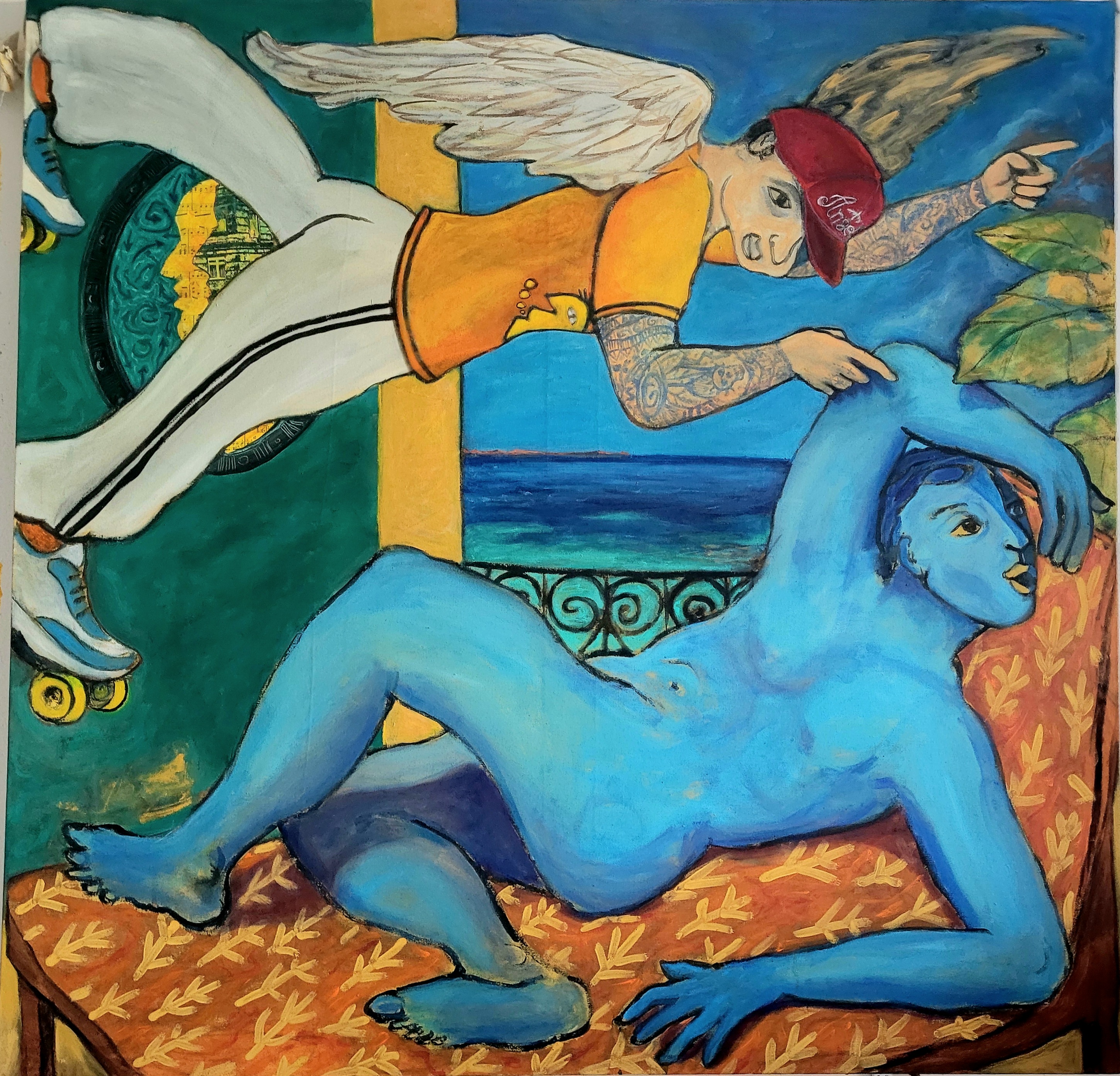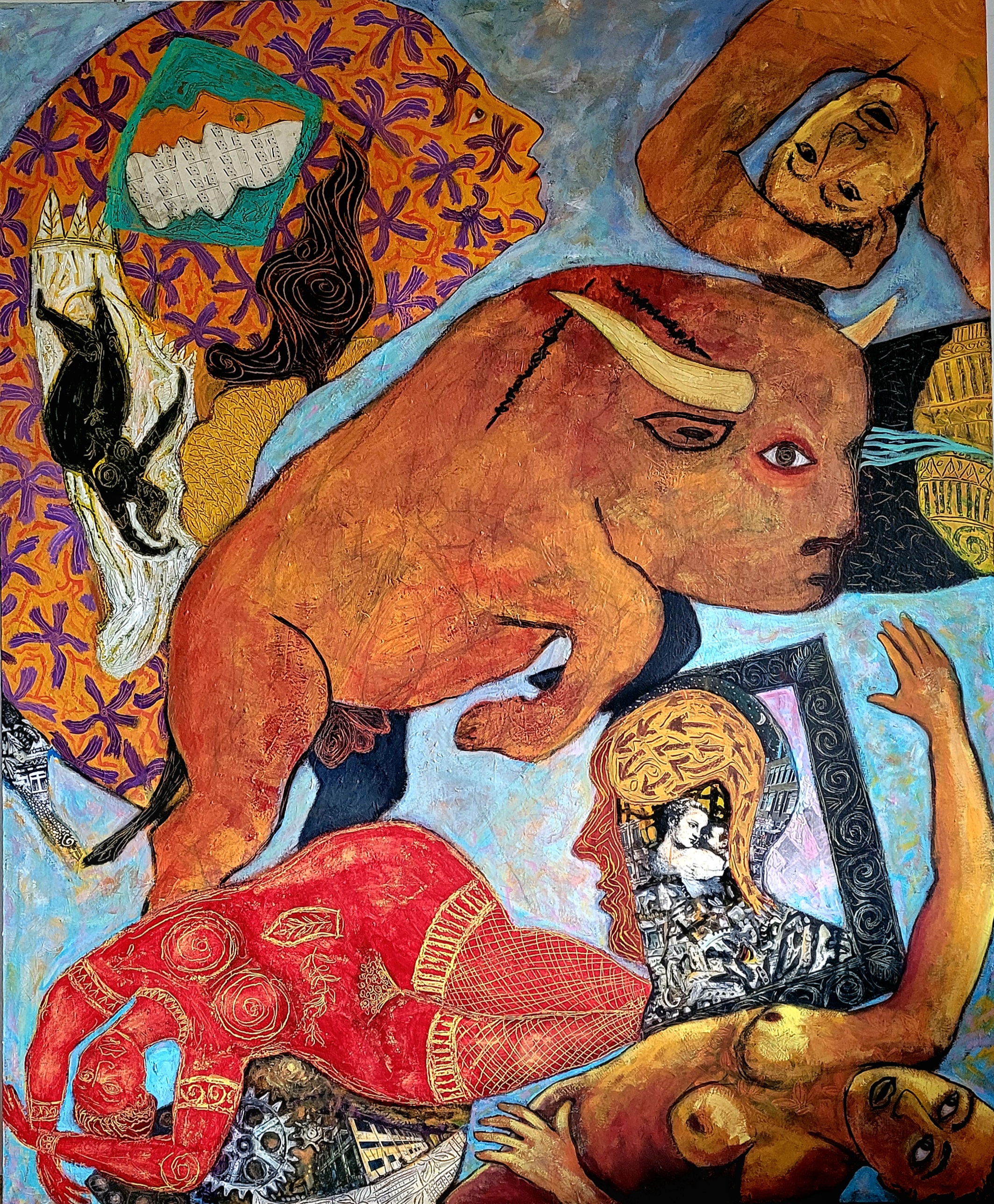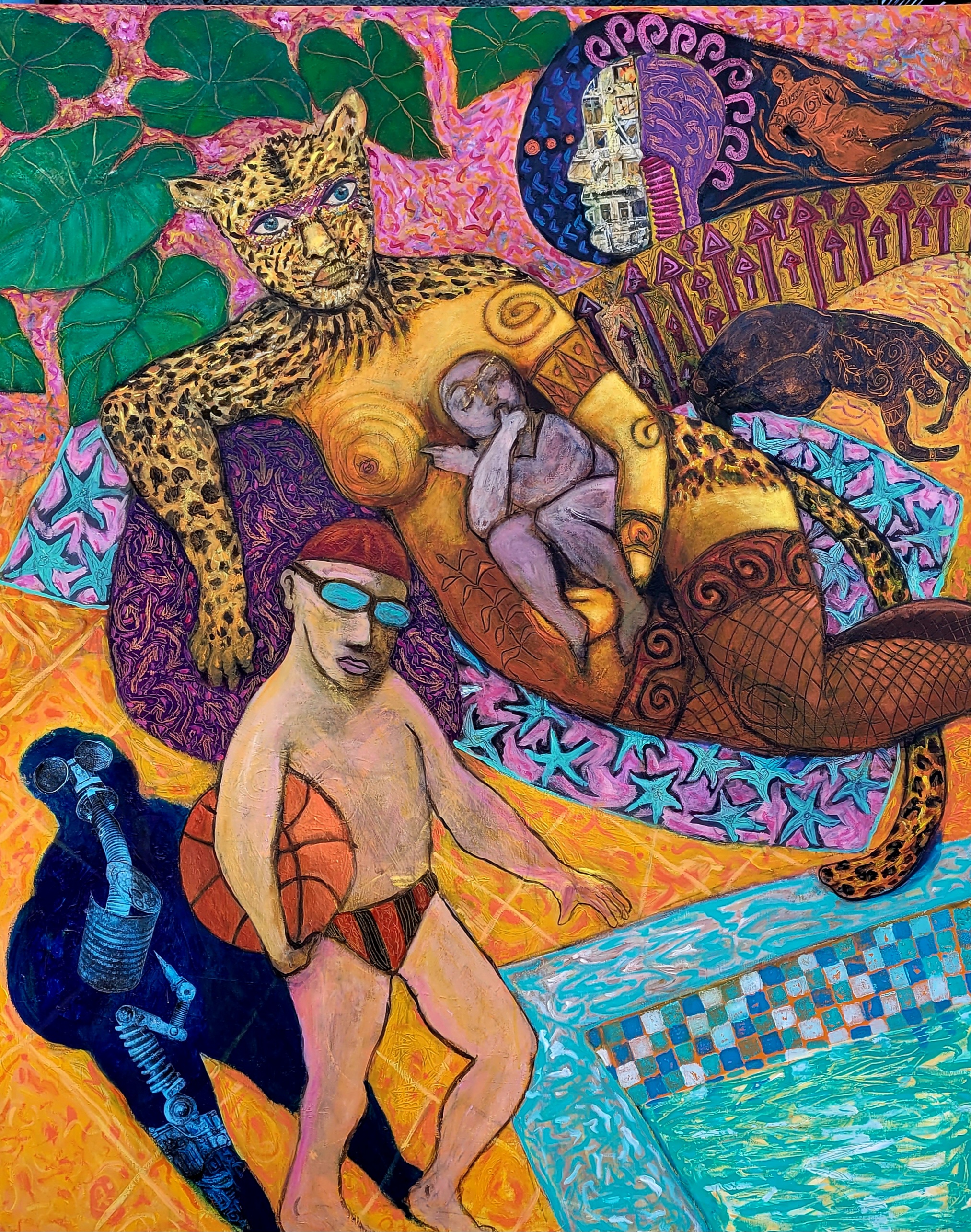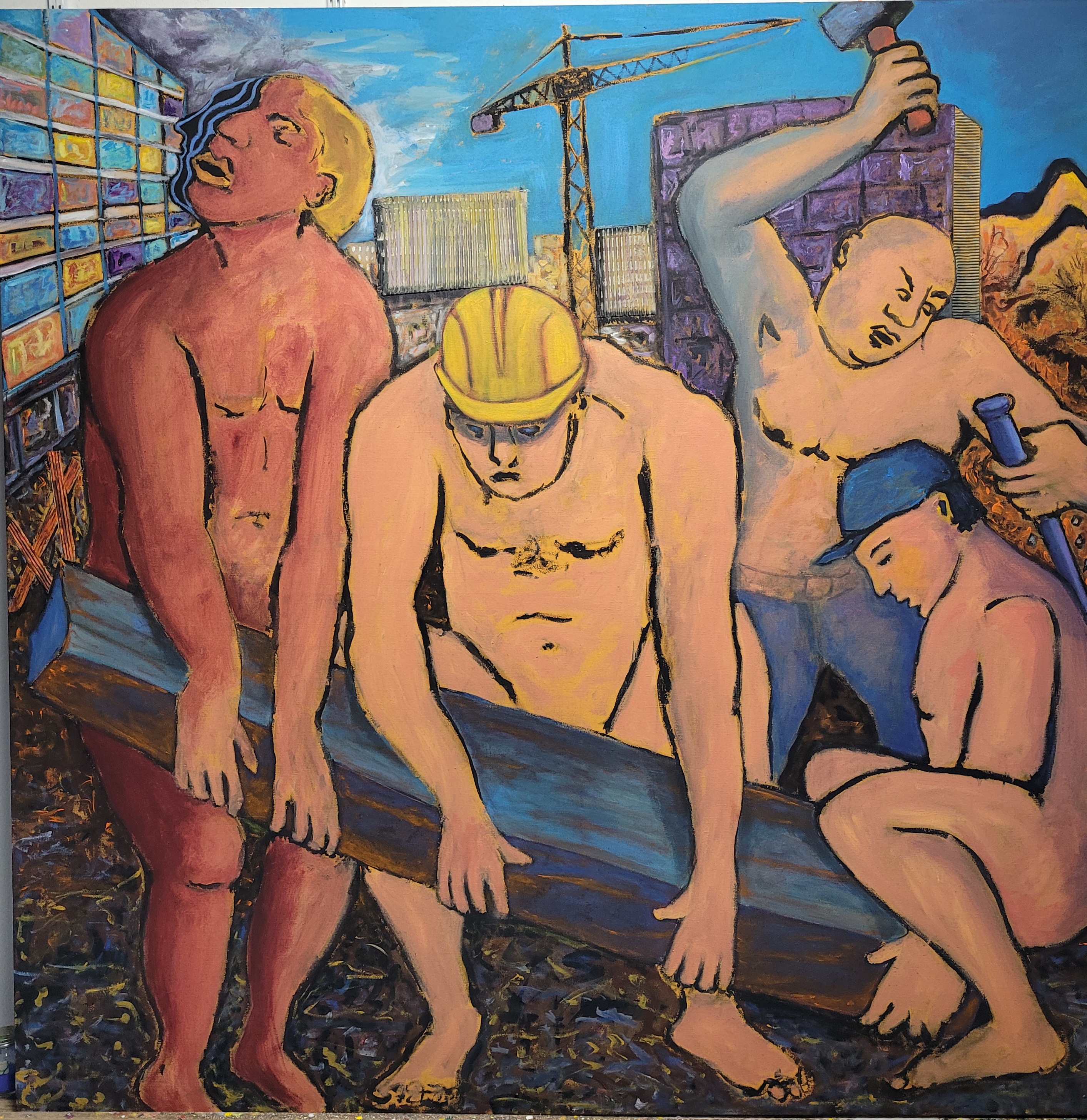 Bruno Lassalle propose une peinture vibrante et symbolique où se croisent des influences variées, allant du surréalisme à l’expressionnisme. Par la fusion des styles et des époques, ses tableaux, chargés de symboles et d’émotions, interrogent les relations humaines, les tensions sociales, et le poids de l’histoire sur la société contemporaine. Chaque personnage, souvent empreint de traits fantastiques ou mythologiques, porte une narration personnelle qui reflète des questionnements plus vastes sur l’identité, la lutte et la résilience. Bruno Lassalle puise aussi dans des références culturelles modernes comme le hip-hop ou le steampunk, pour ancrer son travail dans la contemporanéité, tout en dialoguant avec le passé. Il utilise un langage pictural à la fois coloré et expressif, où la distorsion des formes accentue l’intensité émotionnelle des scènes, créant ainsi une peinture qui transcende le temps et les genres.