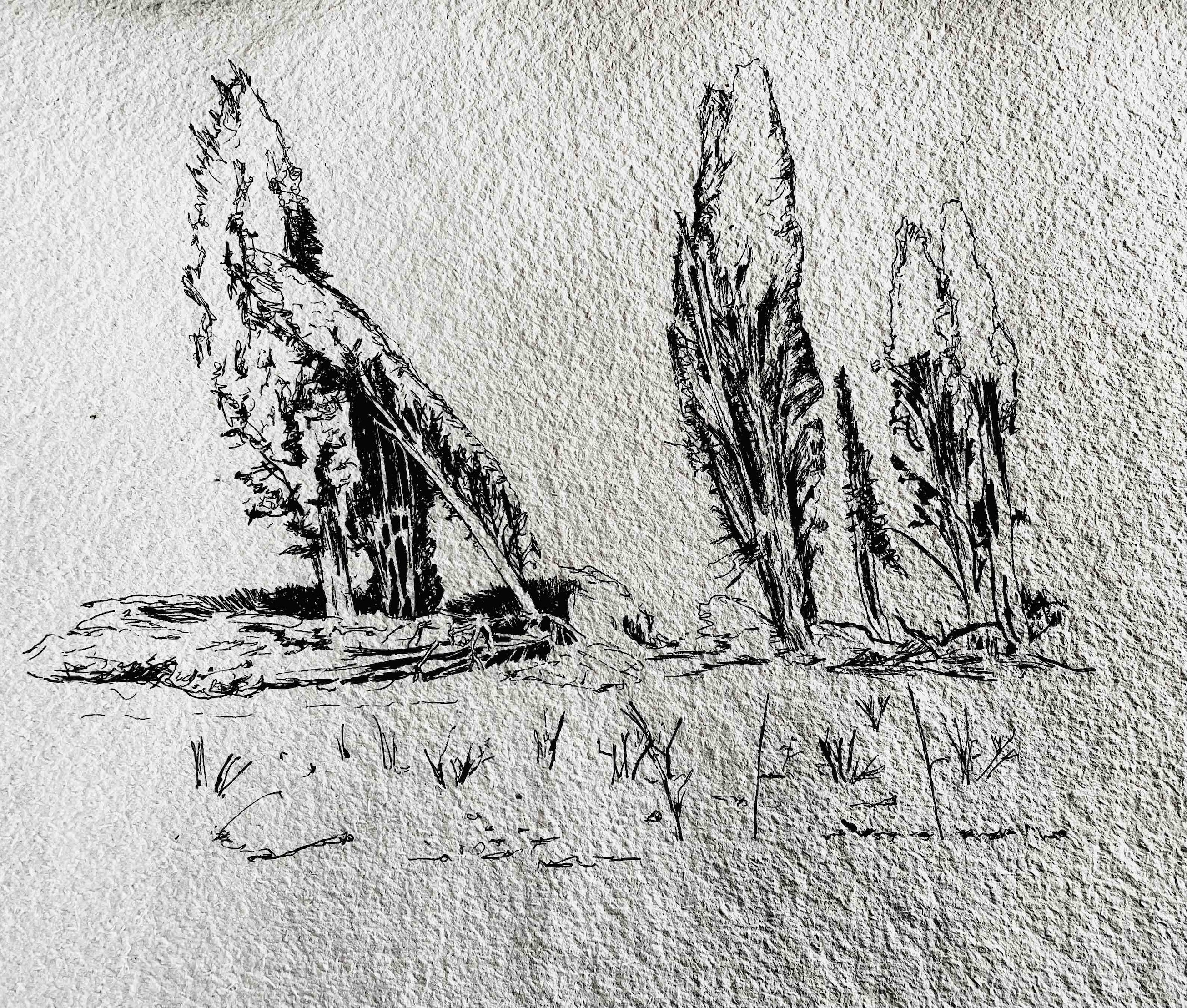 "Là où il y avait la beauté, là où tout est détruit, je vois encore de la beauté et j’essaye de partager ce regard dans mes dessins des silhouettes des arbres, des roches et des collines des alentours.
