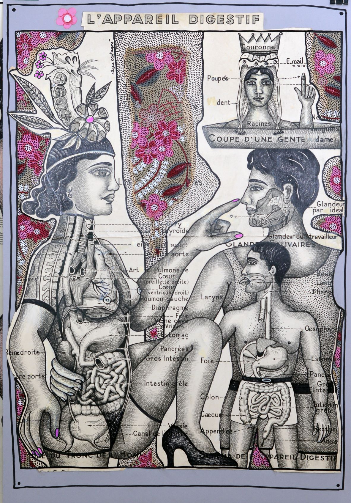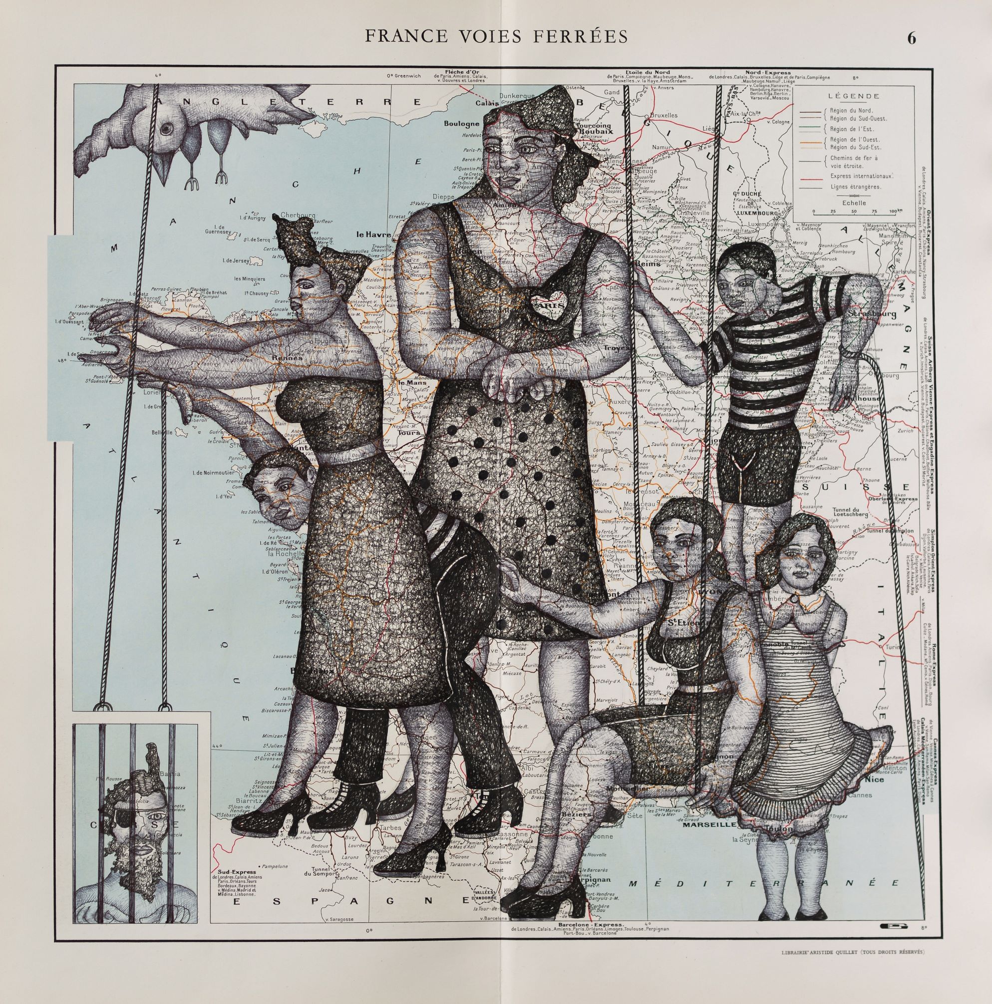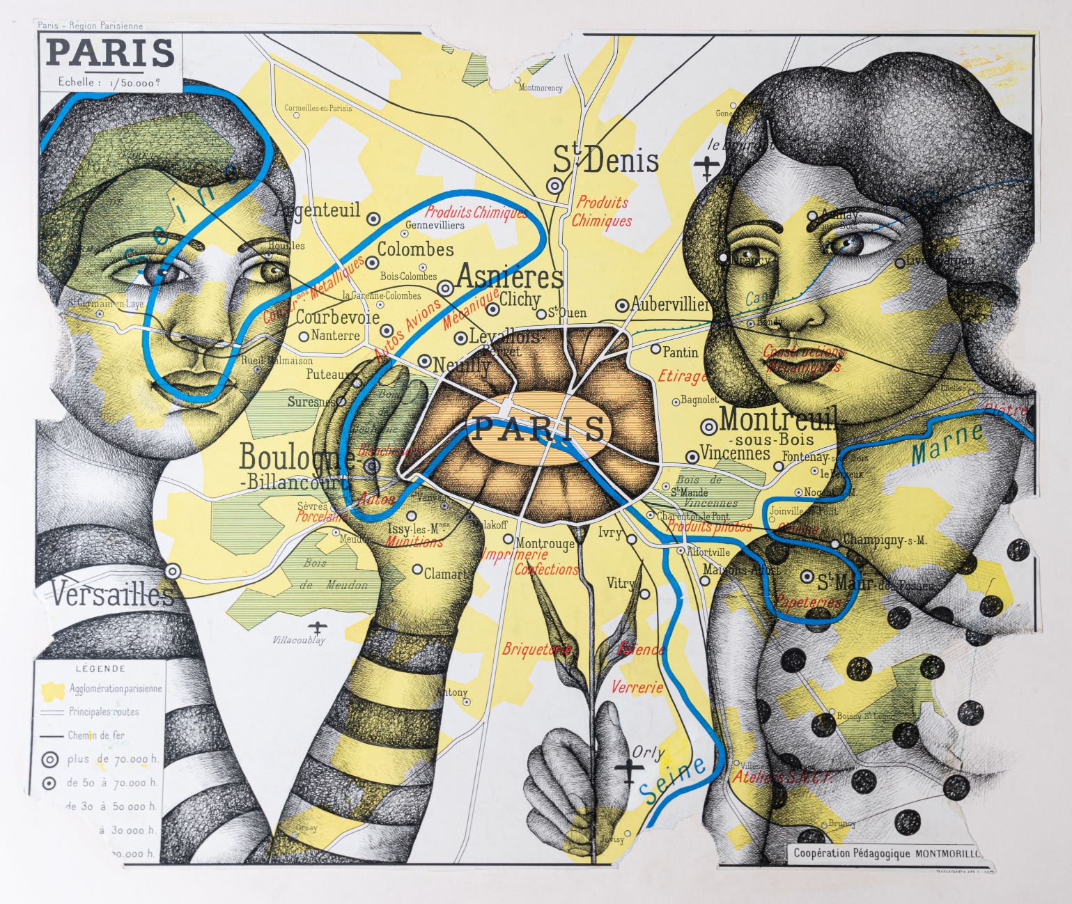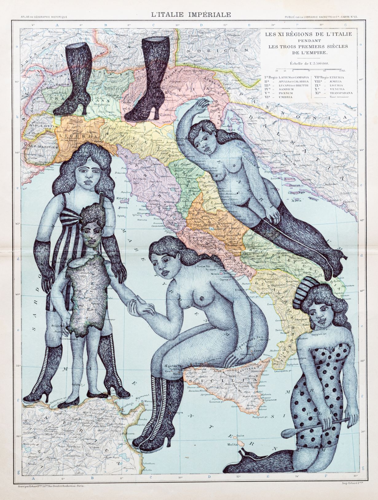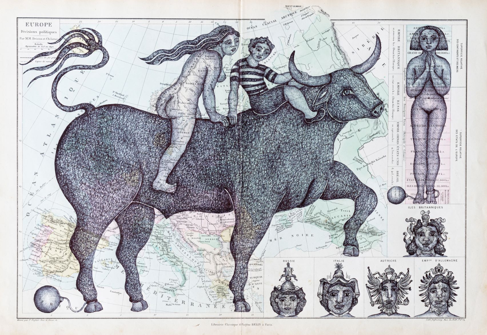 L’essentiel de mon travail consiste en la réinterprétation de supports existants (photographies anciennes, planches anatomiques, cartes géographiques…..). A travers mon dessin figuratif, je propose un univers peuplé de personnages fantasmatiques inspirés de temps anciens et modernes. Les supports anciens que j’utilise servent de point de départ et guident mon trait. Les mythes anciens ou plus récents m’aident à explorer l’universalité de l’humain. Je renouvelle ainsi l’art du collage et de la superposition, cher aux artistes du Bahaus.