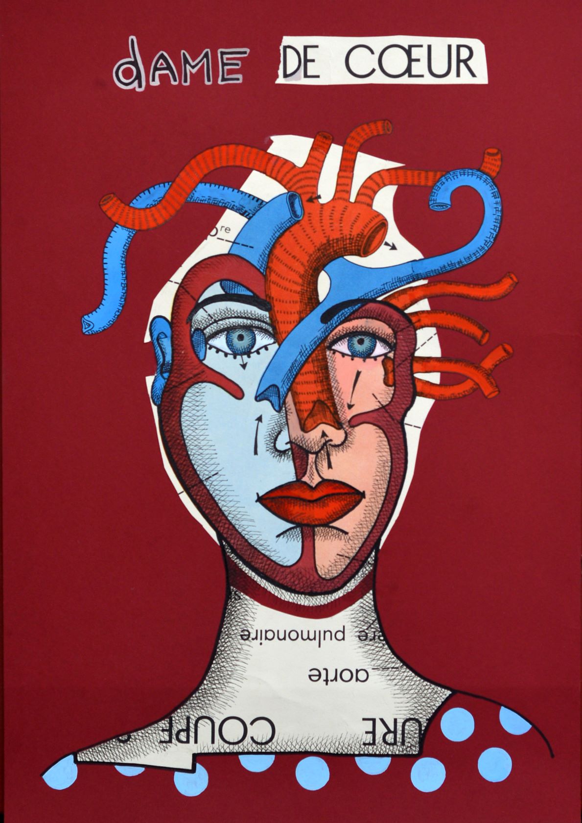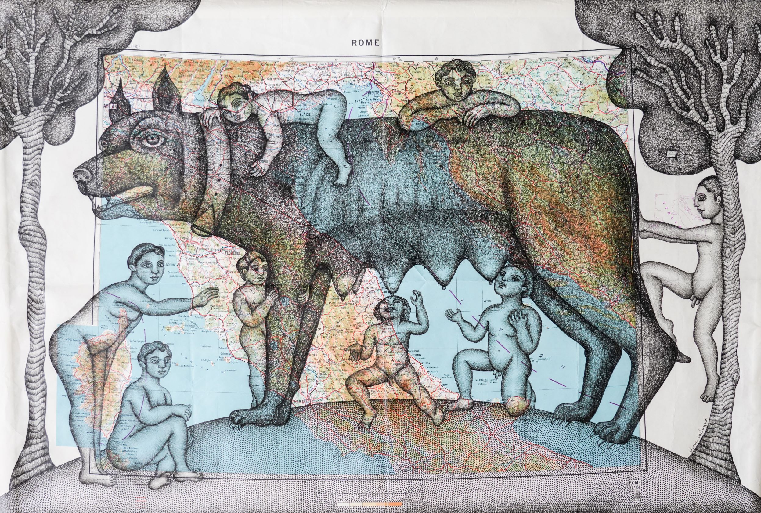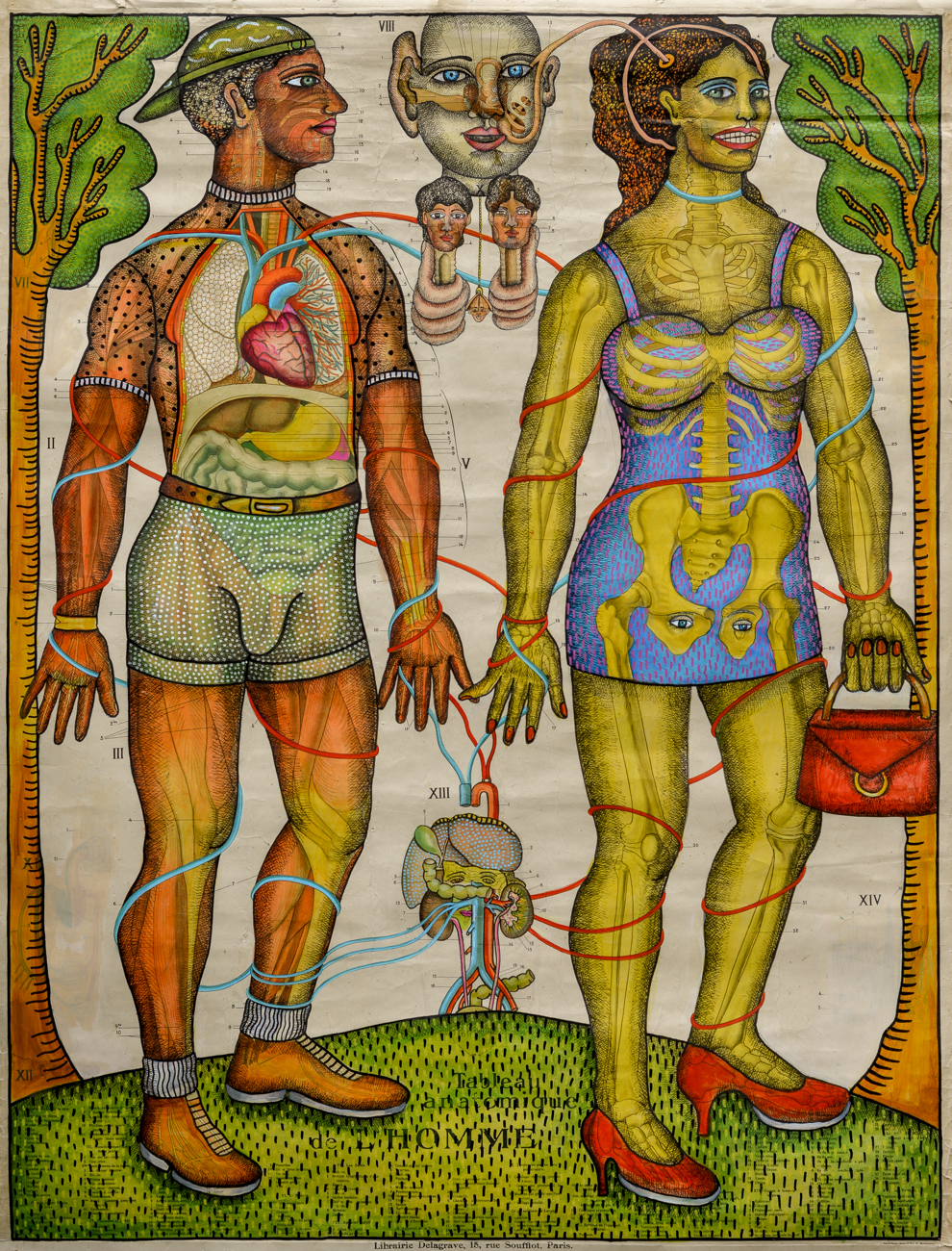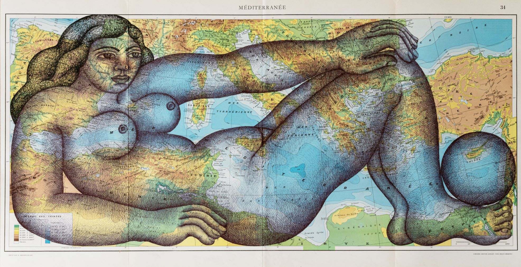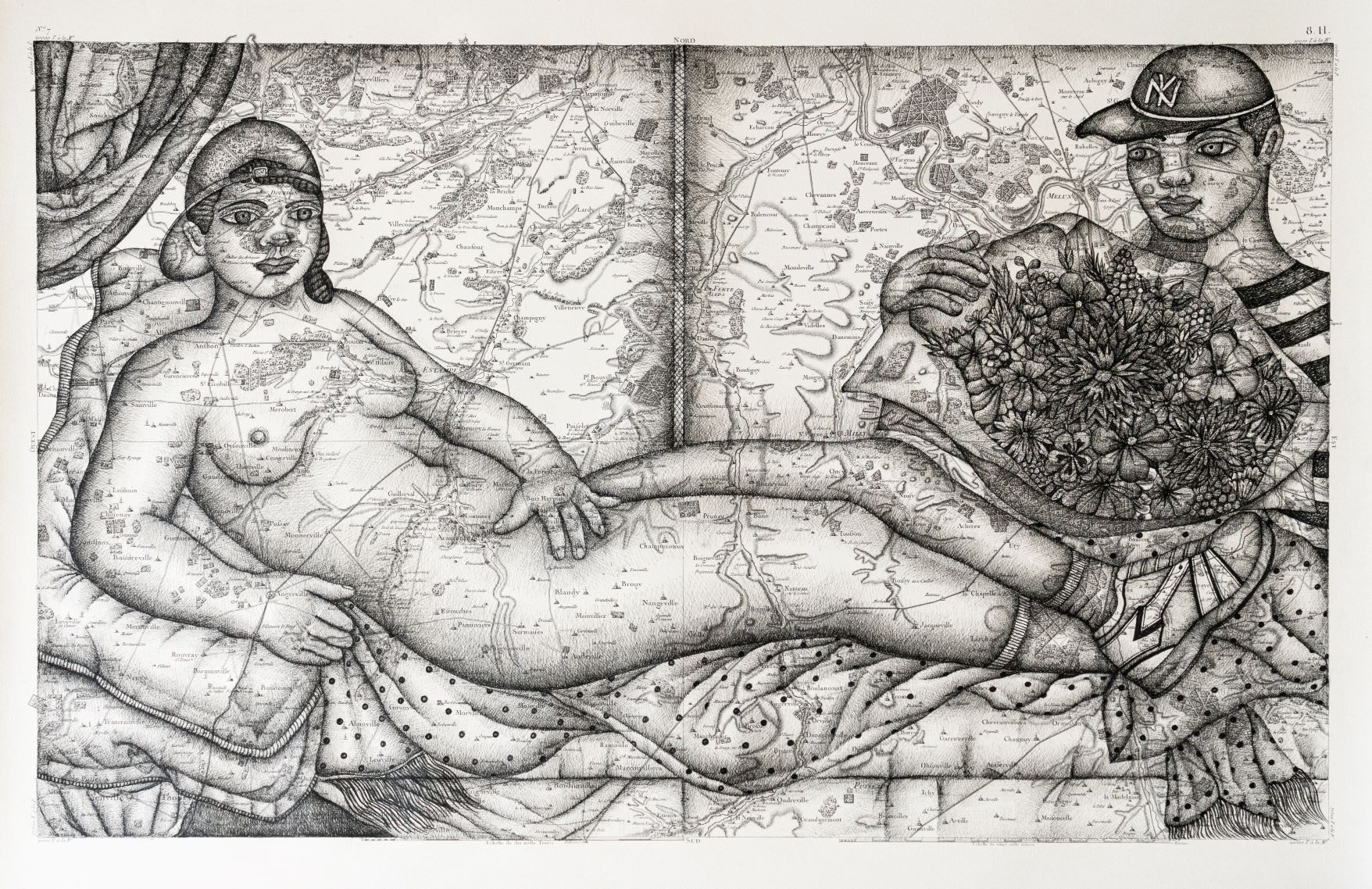 L’essentiel de mon travail consiste en la réinterprétation de supports existants (photographies anciennes, planches anatomiques, cartes géographiques…..). A travers mon dessin figuratif, je propose un univers peuplé de personnages fantasmatiques inspirés de temps anciens et modernes. Les supports anciens que j’utilise servent de point de départ et guident mon trait. Les mythes anciens ou plus récents m’aident à explorer l’universalité de l’humain. Je renouvelle ainsi l’art du collage et de la superposition, cher aux artistes du Bahaus.