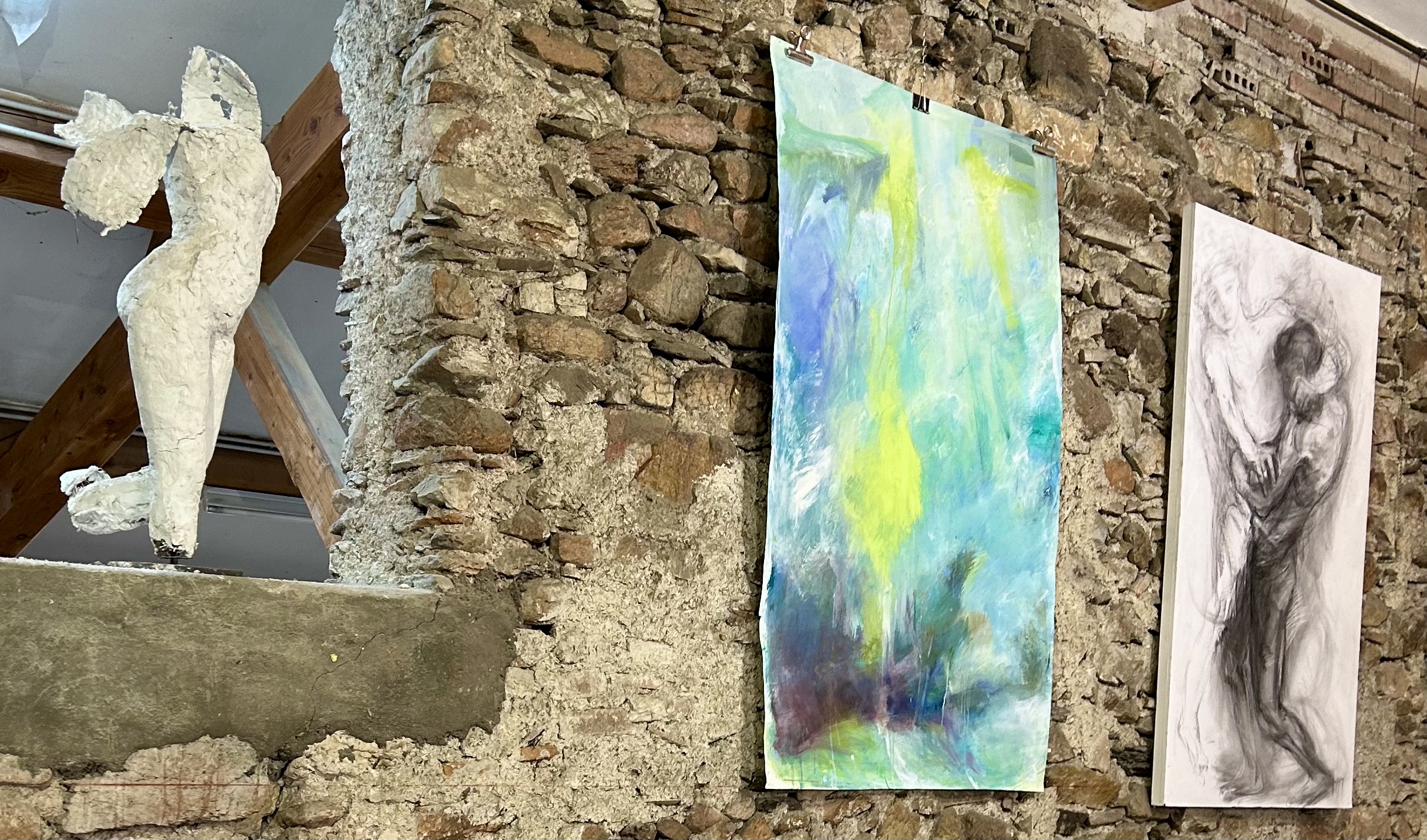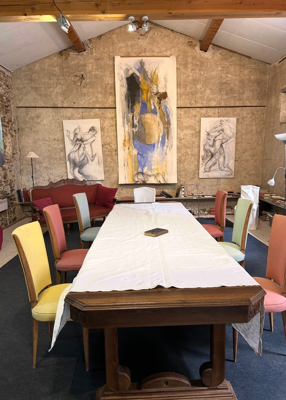 A l’étage, une grande pièce d’exposition de 80 m2 , mur en pierre haut de 4 à 6 mètres. Enfin une autre pièce de 80 m2 environ est le lieu même où je travaille régulièrement. Les trois pièces seront ouvertes au public.