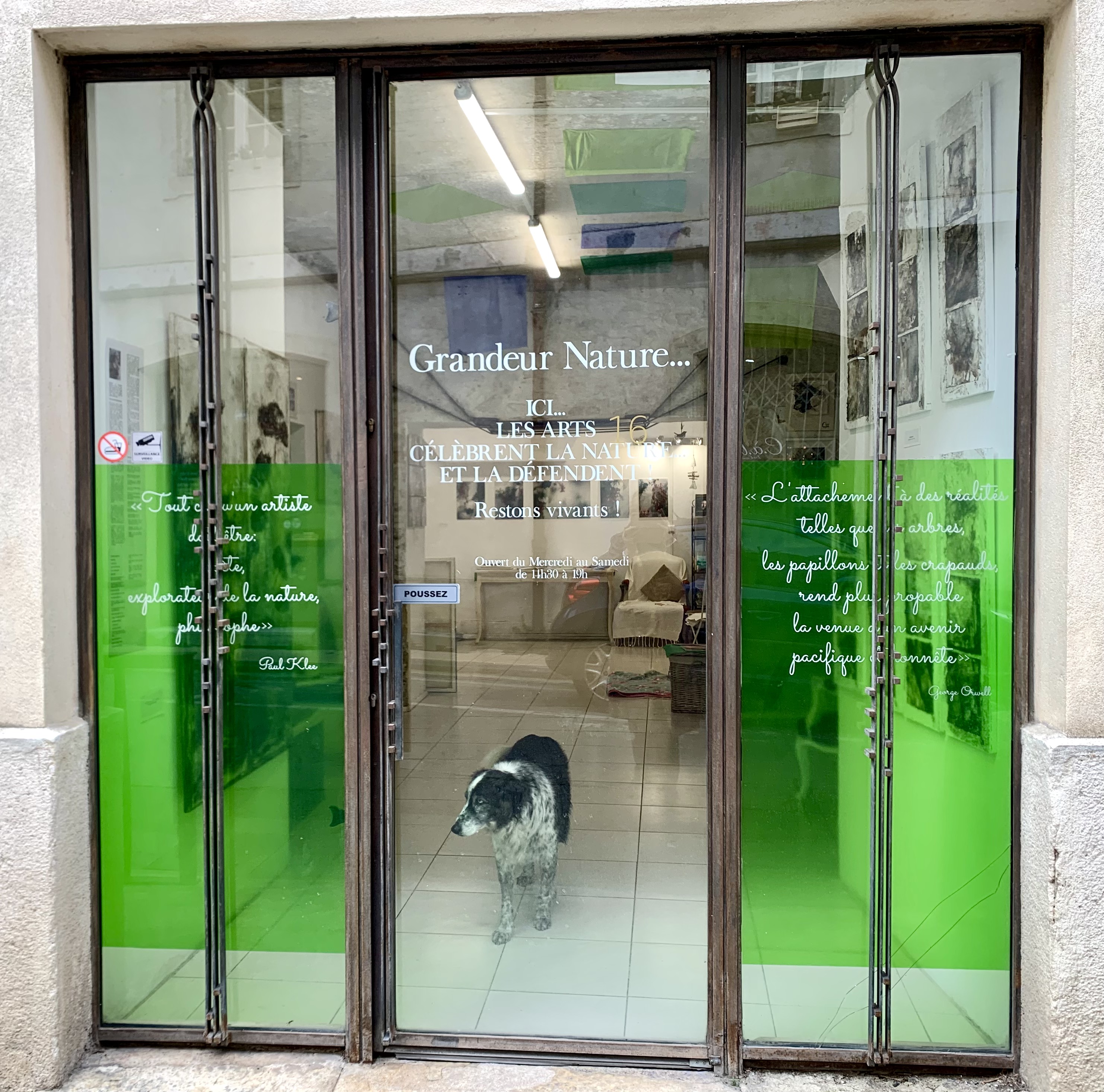 Sa vitrine annonce clairement l’intention et la couleur : "Ici, les arts célèbrent la Nature et la défendent. Restons Vivants !". l’artiste y travaille, y présente ses oeuvre plastiques et ses livres (poésie, essai, textes et photos…) en lien avec le Vivant, ainsi que le travail d’autres artistes sur ce thème.