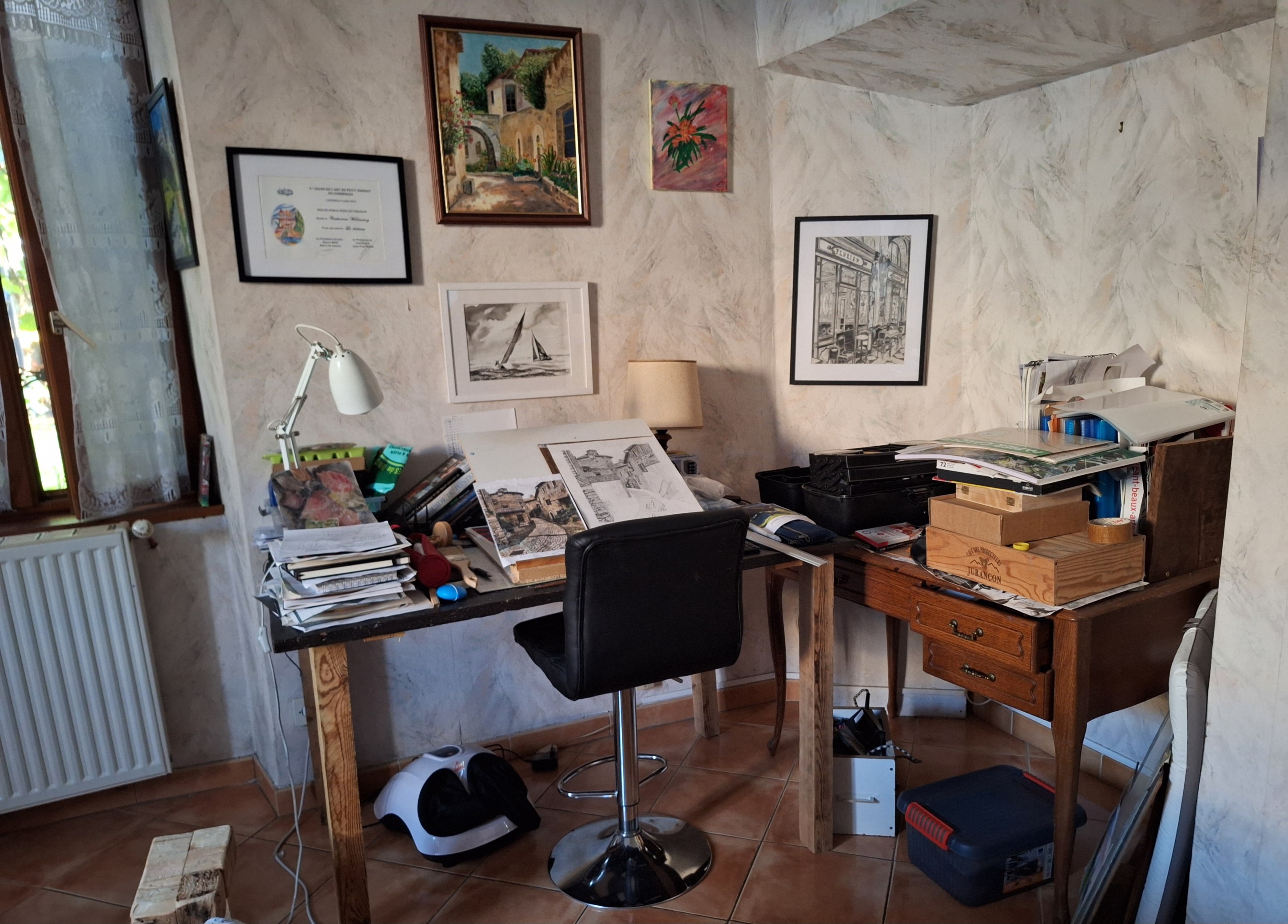 Grande cour accessible même aux personnes handicapées (je peux aider à la descente de 2 toutes petites marches). La plupart de mes oeuvres seront exposées sous le hangar, le lieu où je travaille étant tout simplement ma salle à manger. Le bas de la maison sera ouvert au public pour voir les tableaux accrochés à l’intérieur