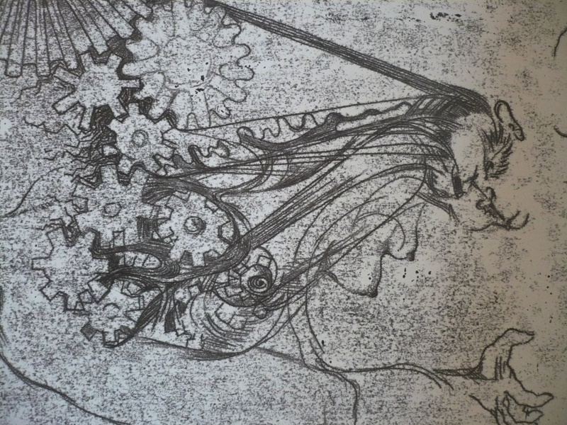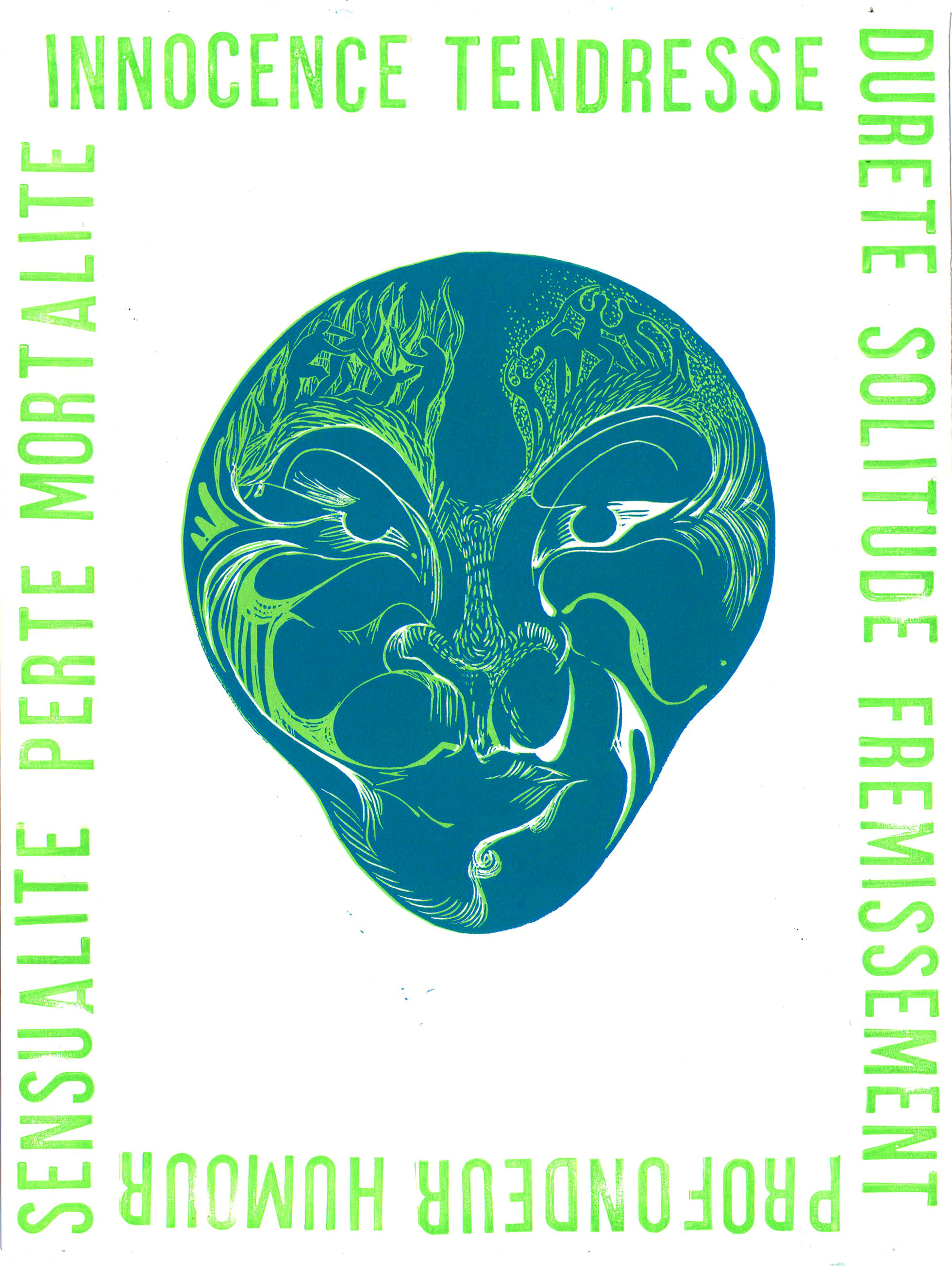 Estampilleuse, je pratique la gravure, la sérigraphie et la typographie sur papiers et textiles de récupération. Techniques à matrices, généreuses, multiplicatrices de couleurs, de compositions, de superpositions et de possibles partages.