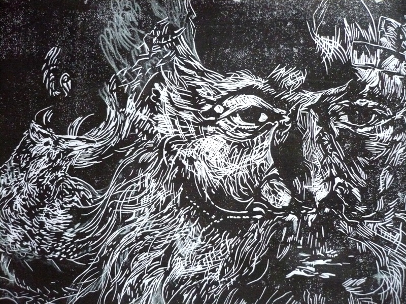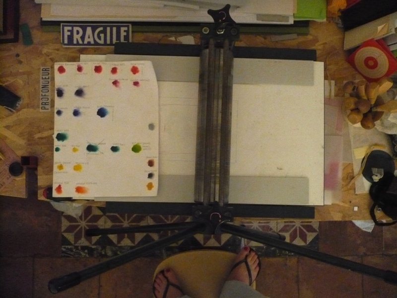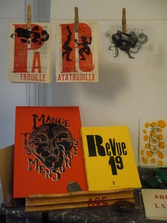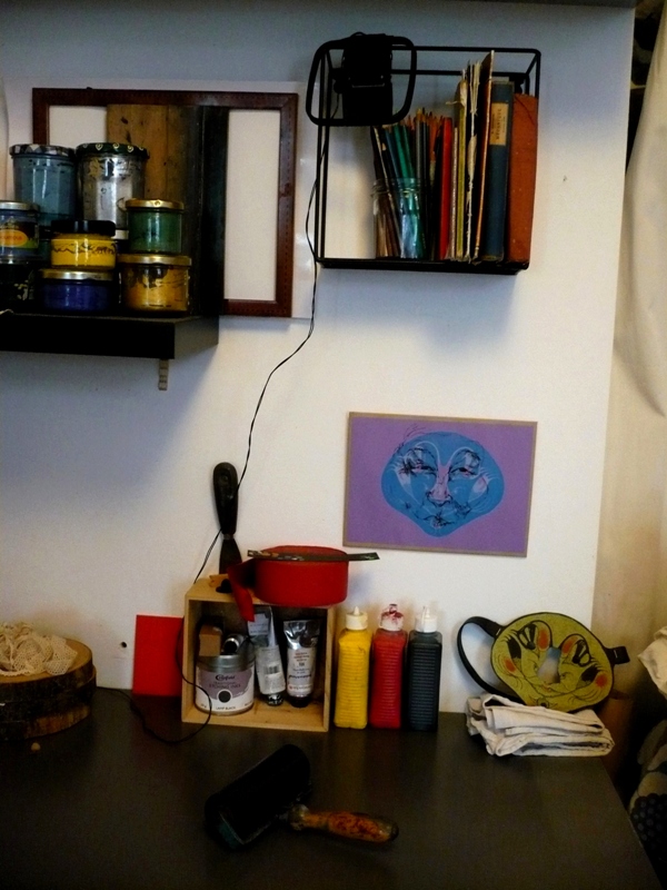 A la fois lieu de travail et lieu de vie, l’atelier peut se déplacer dans l’espace, sauf la presse indétrônable, de la cuisine à la chambre, de l’intérieur à l’extérieur, selon la pratique et le temps. Espace où graver puis imprimer les linogravure, espace pour la sérigraphie et ses écrans, espace de composition et d’impression typographique, espace de séchage des estampes…