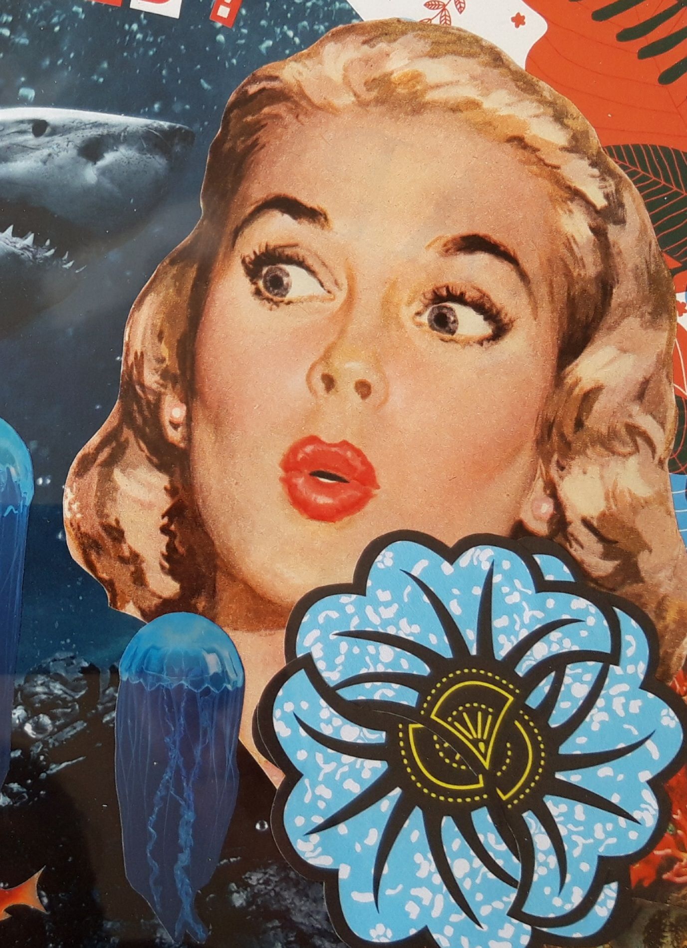 Mes inspirations viennent de la nature, de la ville, des voyages… mais également du théâtre, de la danse, du cinéma, de la photographie… ainsi que de la représentation de la femme dans les années 50-60. Je détourne avec malice l’image uniformisée et corsetée des femmes de cette époque pour permettre à toutes les femmes, dans mes collages, d’affirmer leur singularité et de goûter à la liberté. Liberté de s’évader, de penser, d’imaginer, d’être soi…