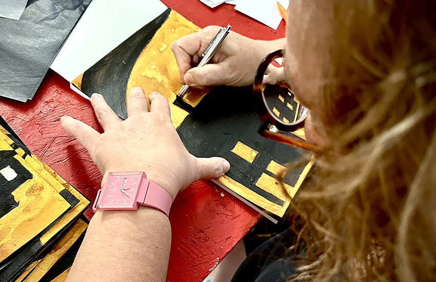 Elle enseigne dix ans. Ses élèves la réconcilient avec peinture et dessin. Pour eux, elle se fait prêtresse de la création contemporaine.