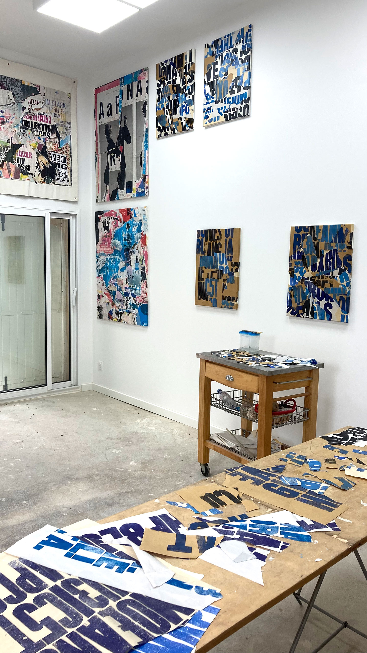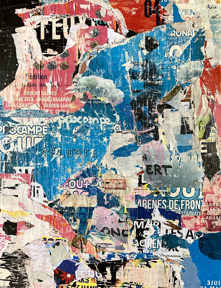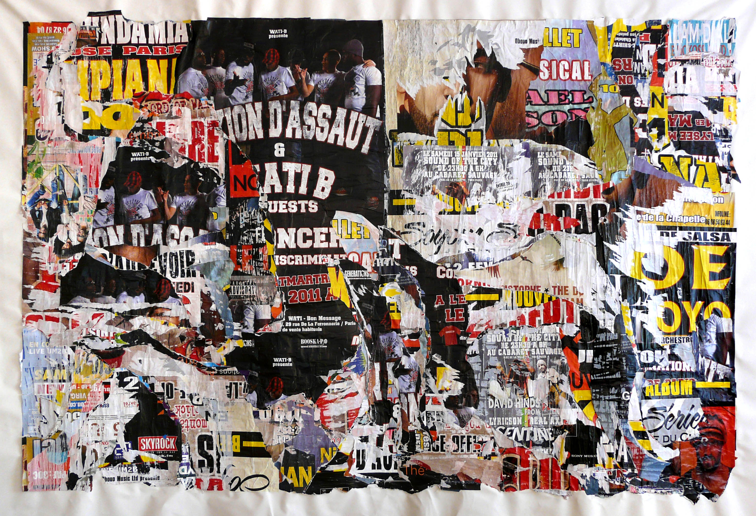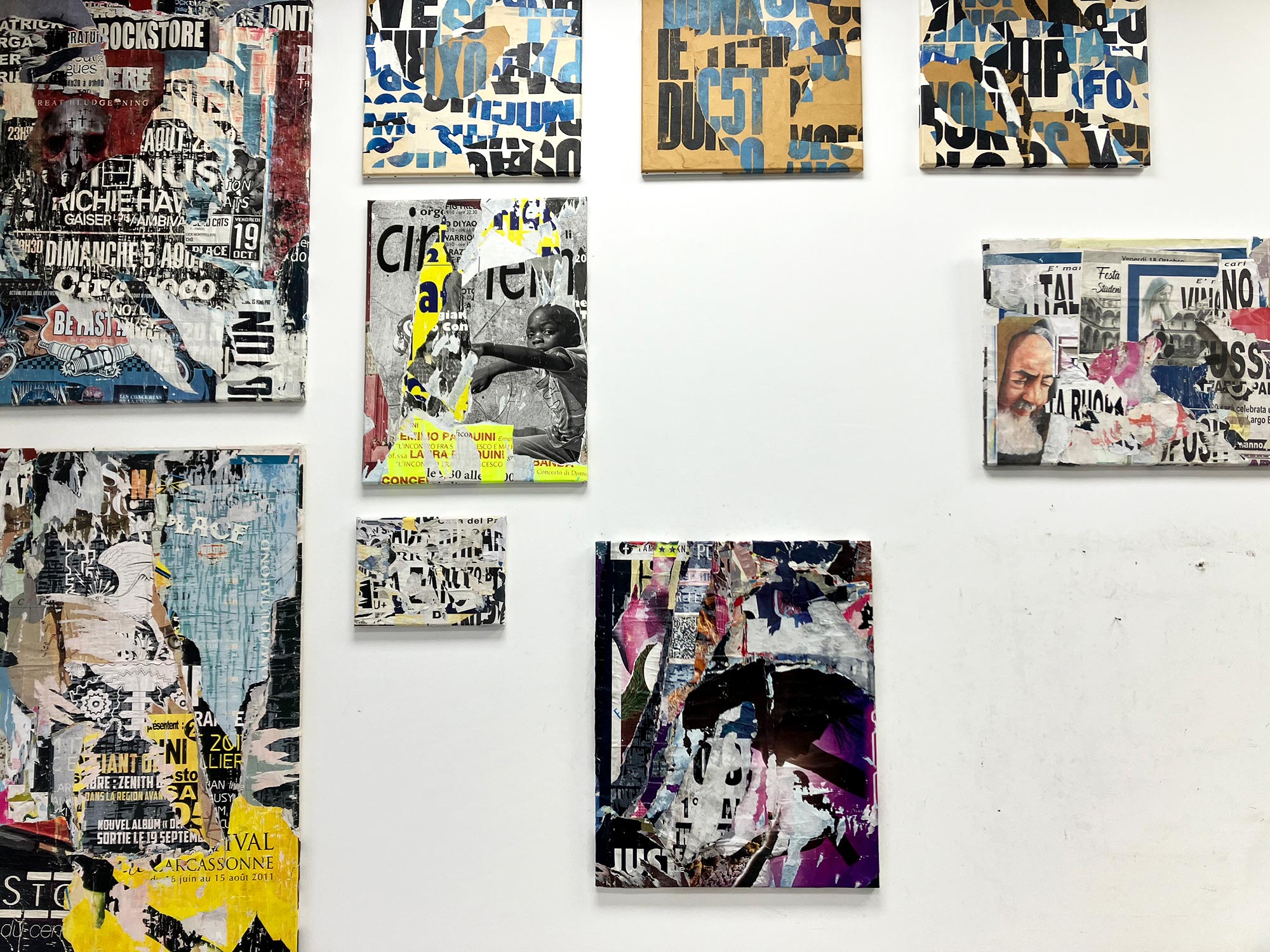 Au sol les affiches abîmées et morceaux de papiers et de cartons s’étalent pour constitiuer la palette à partir de laquelle Christian Gastaldi recompose ses toiles, attentif à la composition et au rythme, cherchant à créer une écriture visuelle similaire à ce qu’est le style pour un écrivain.