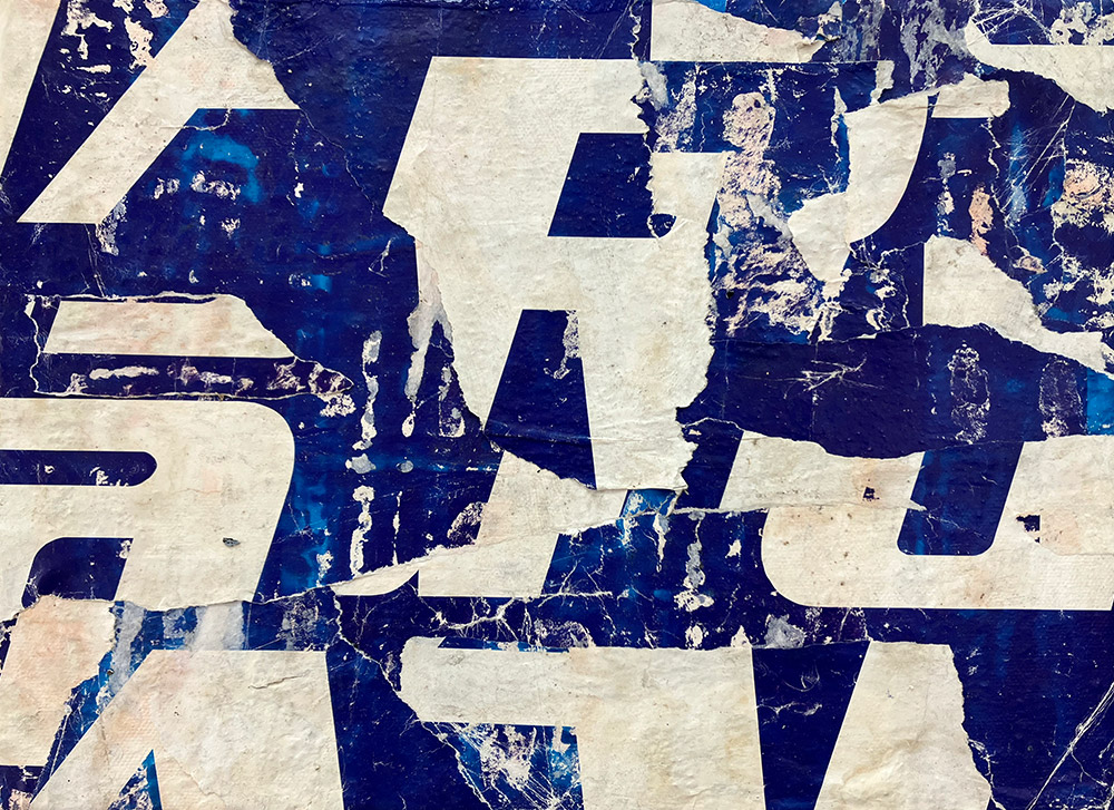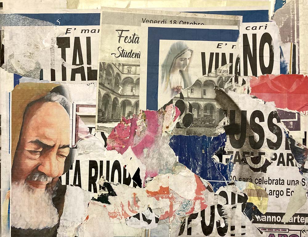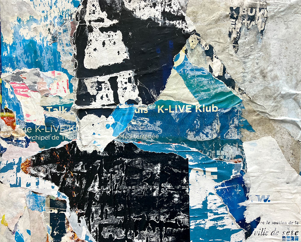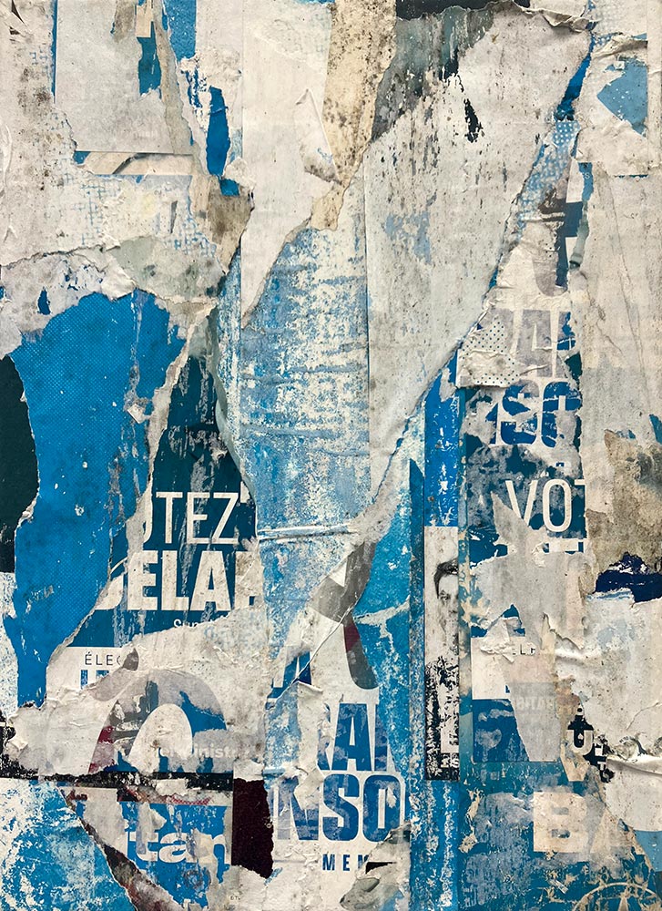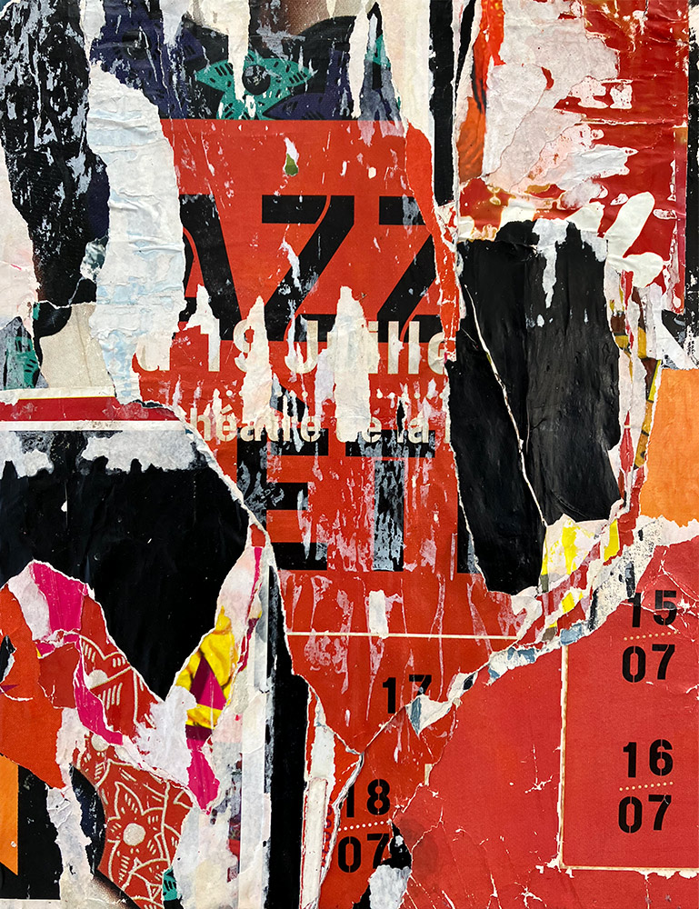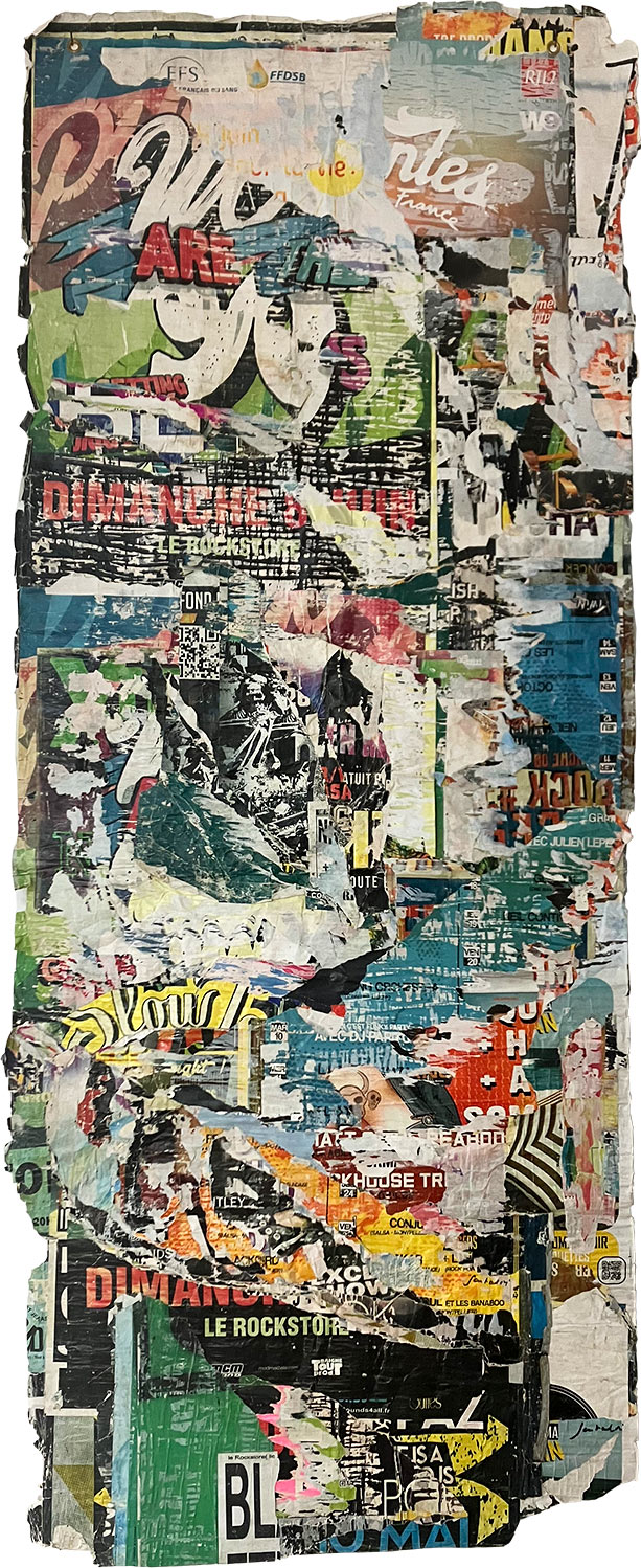 Au sol les affiches abîmées et morceaux de papiers et de cartons s’étalent pour constitiuer la palette à partir de laquelle Christian Gastaldi recompose ses toiles, attentif à la composition et au rythme, cherchant à créer une écriture visuelle similaire à ce qu’est le style pour un écrivain.