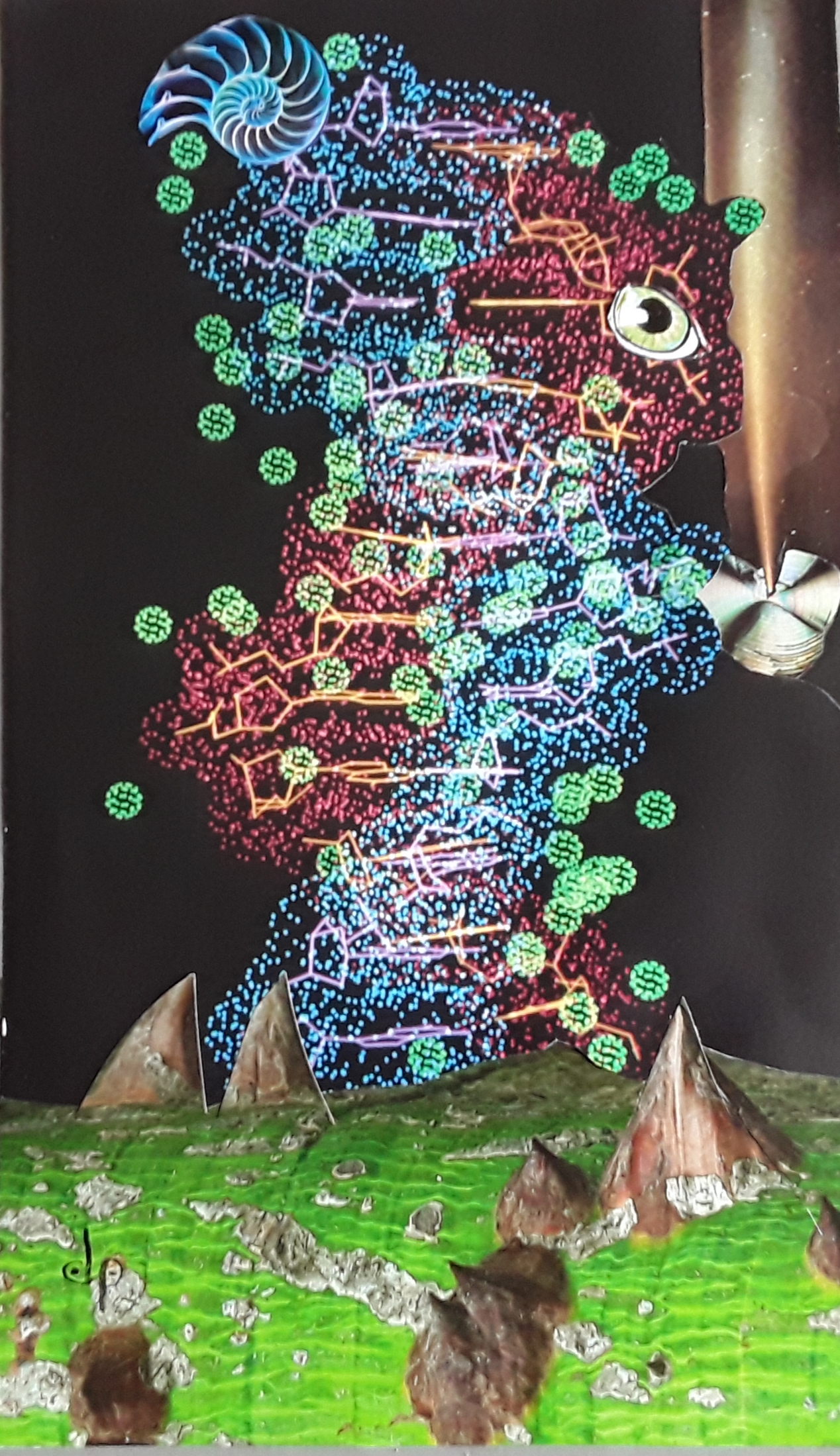 Mon travail de découpe, d’assemblage, de collages, de recherches de complémentarité de formes, de couleurs, de volumes, de perspectives… donne naissance, même inconsciemment, à des univers où l’œil glisse sur l’œuvre de façon atypique.