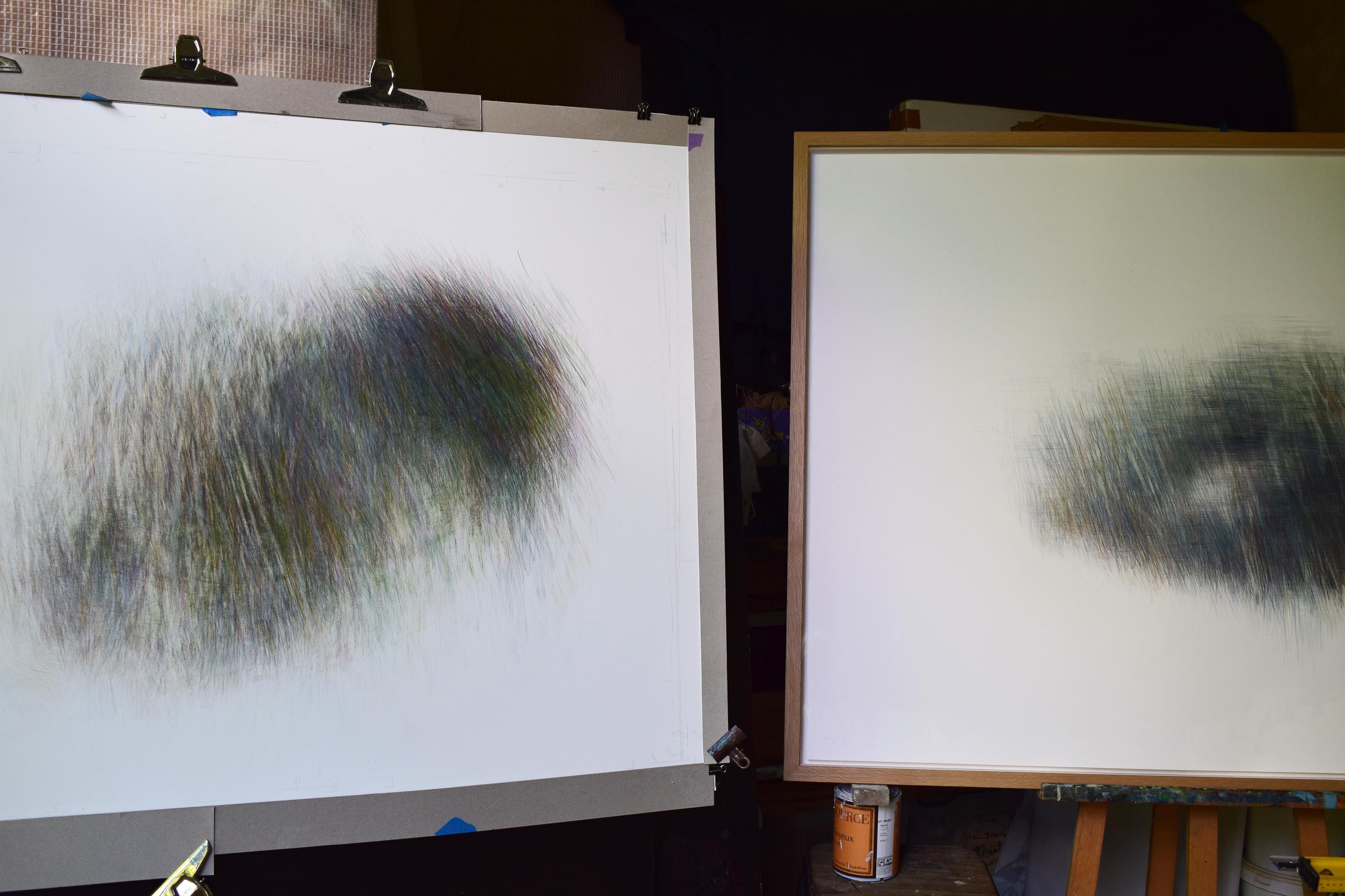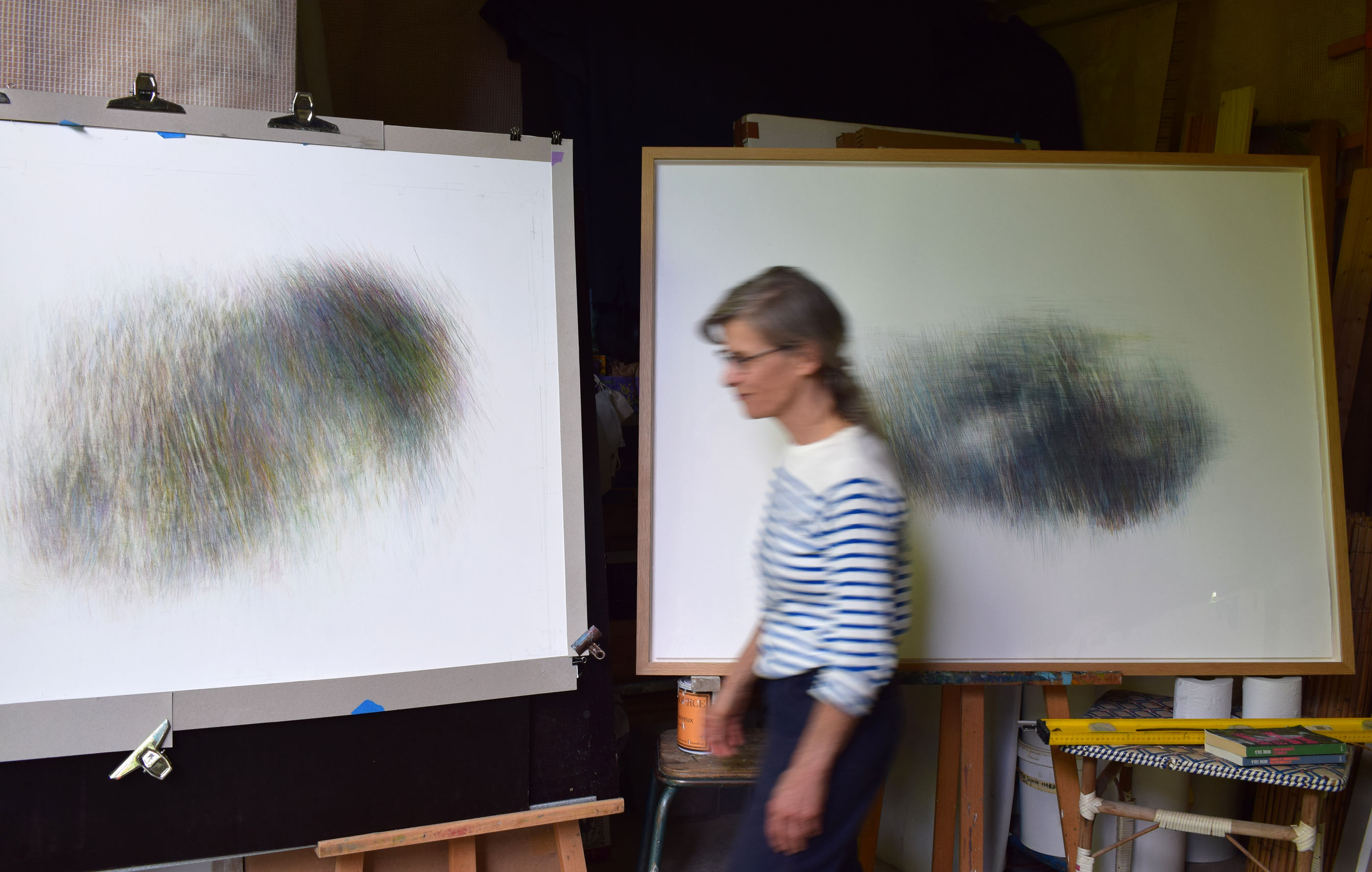Longtemps, j’ai travaillé la matière (ses qualités plastiques, ses résistances…), dans un contexte de commandes privées, en lien avec des architectes d’intérieurs. Cette confrontation aux surfaces murales, faite de gestuelle répétitive, je la retrouve dans ma pratique du dessin ; un "encore et encore", qui s’inscrit, le plus souvent, en de grands formats.