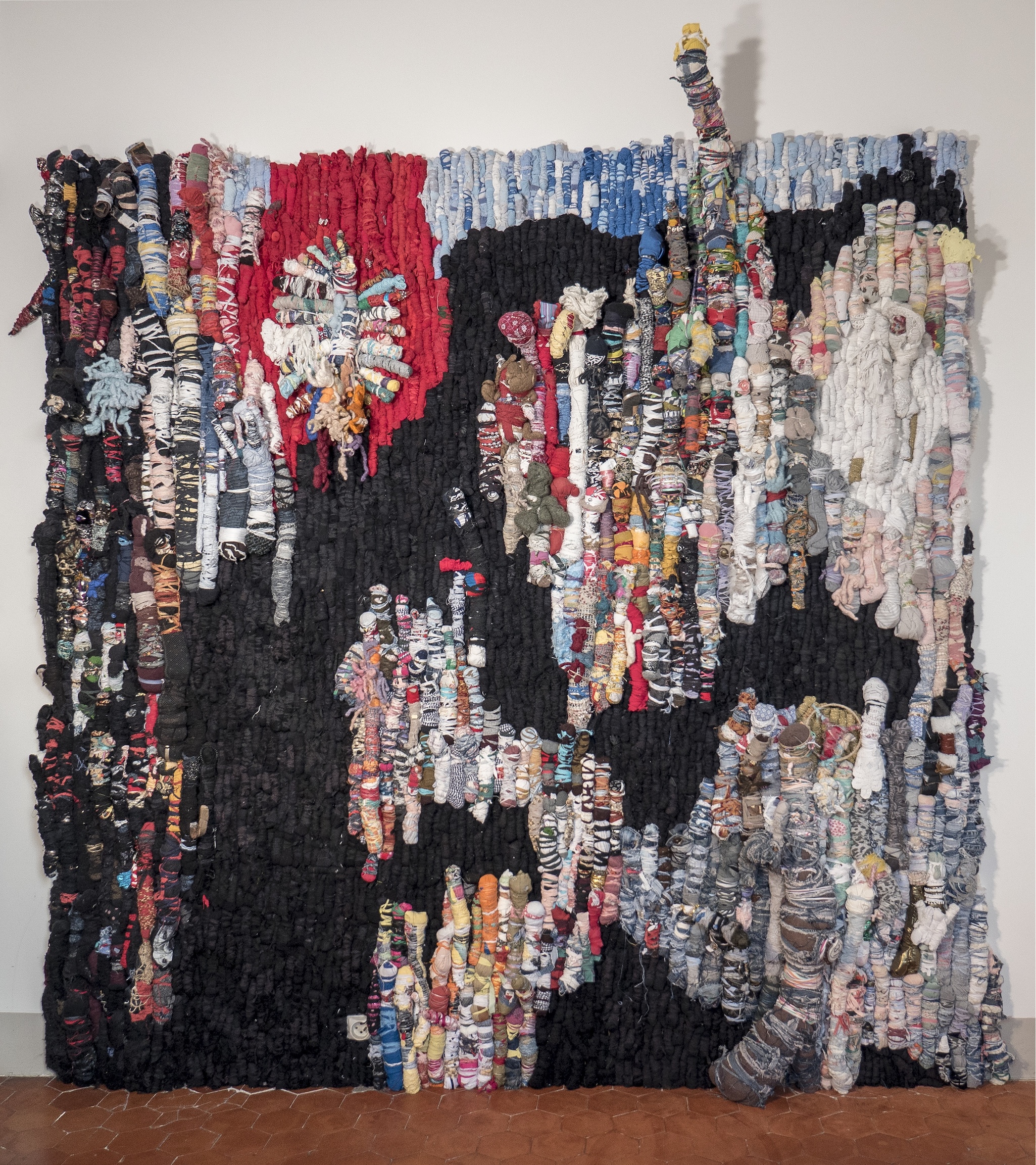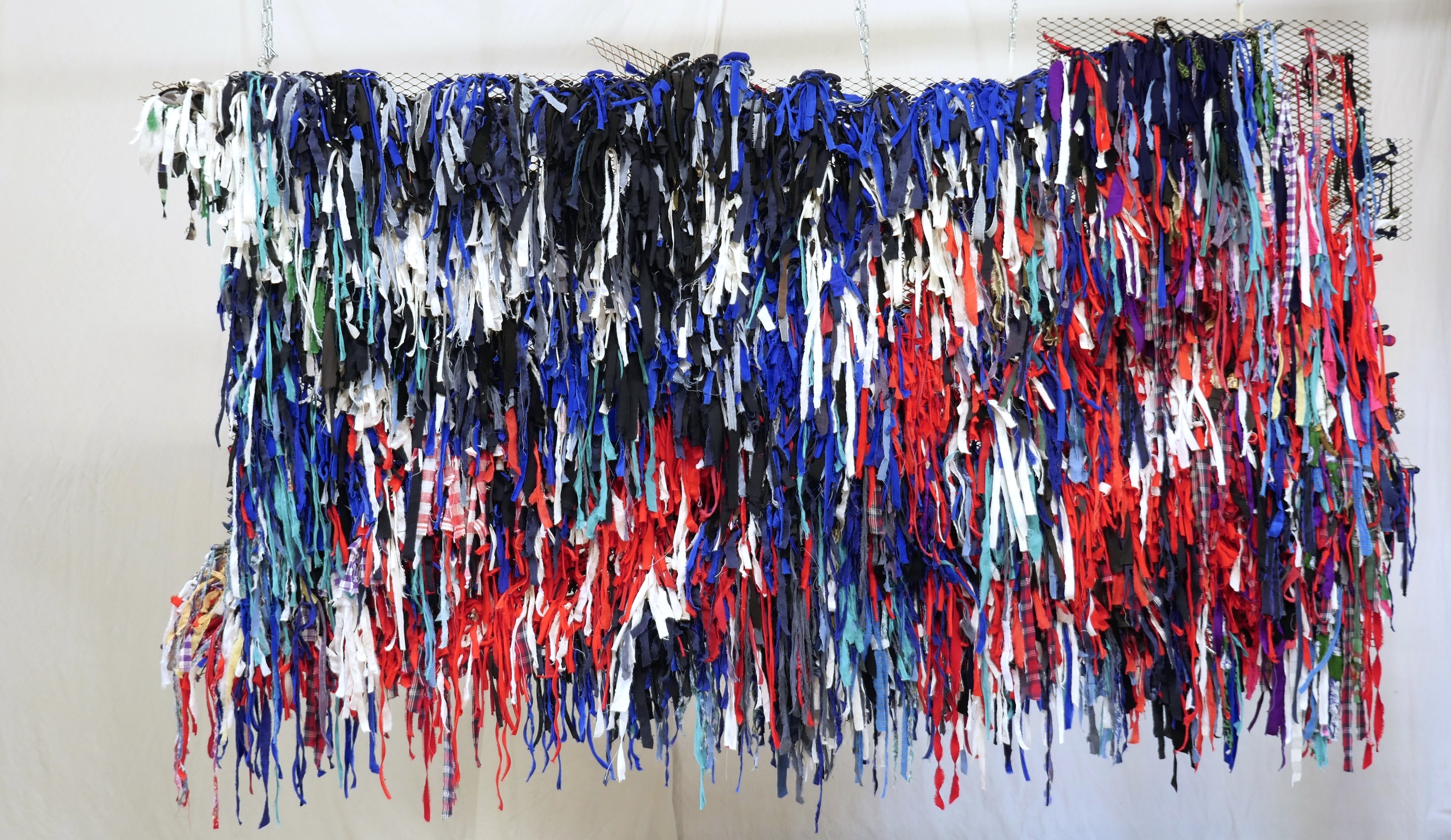 Vêtements et divers cépages textiles déchirés, découpés, cousus, redensifiés, peints, fixés sur métal.