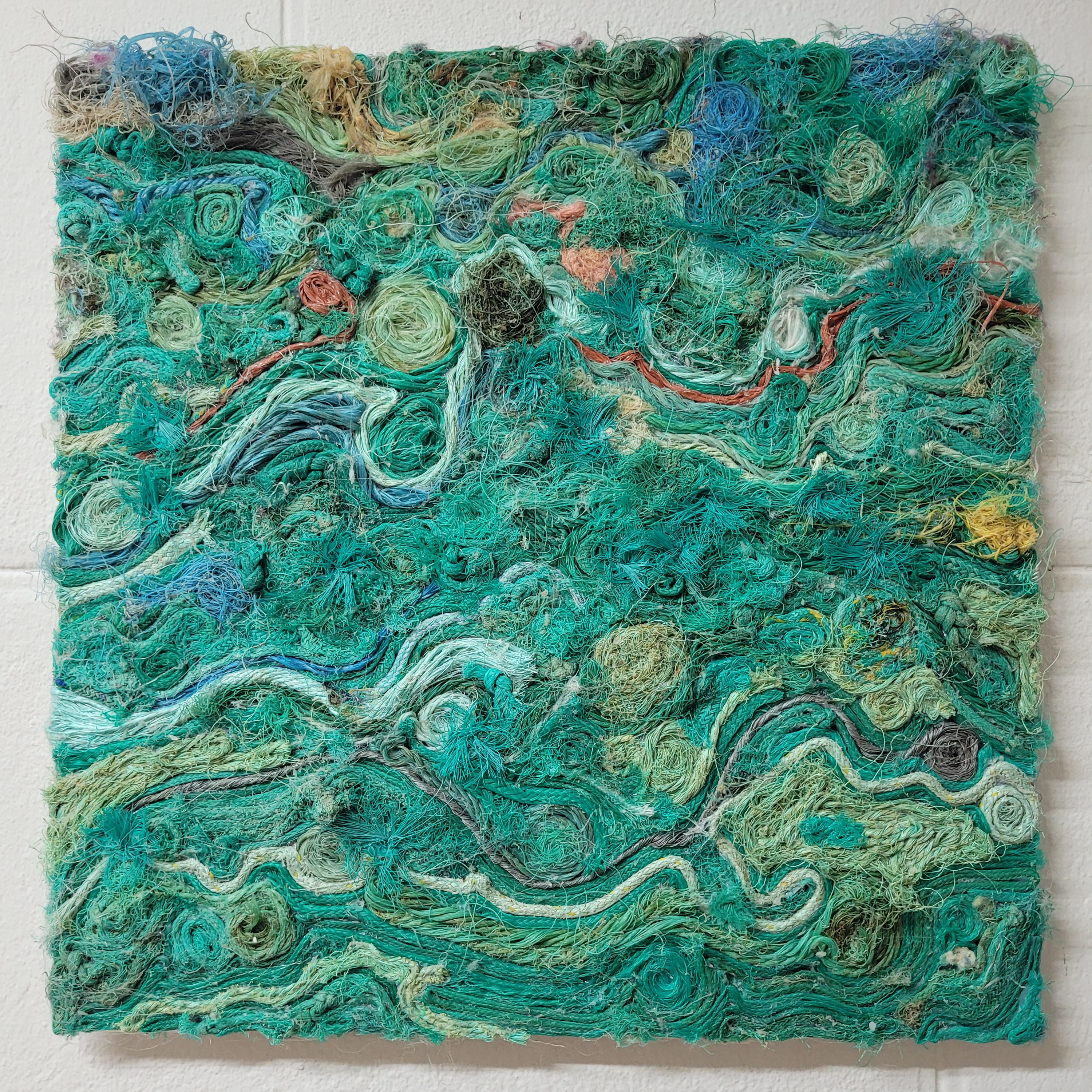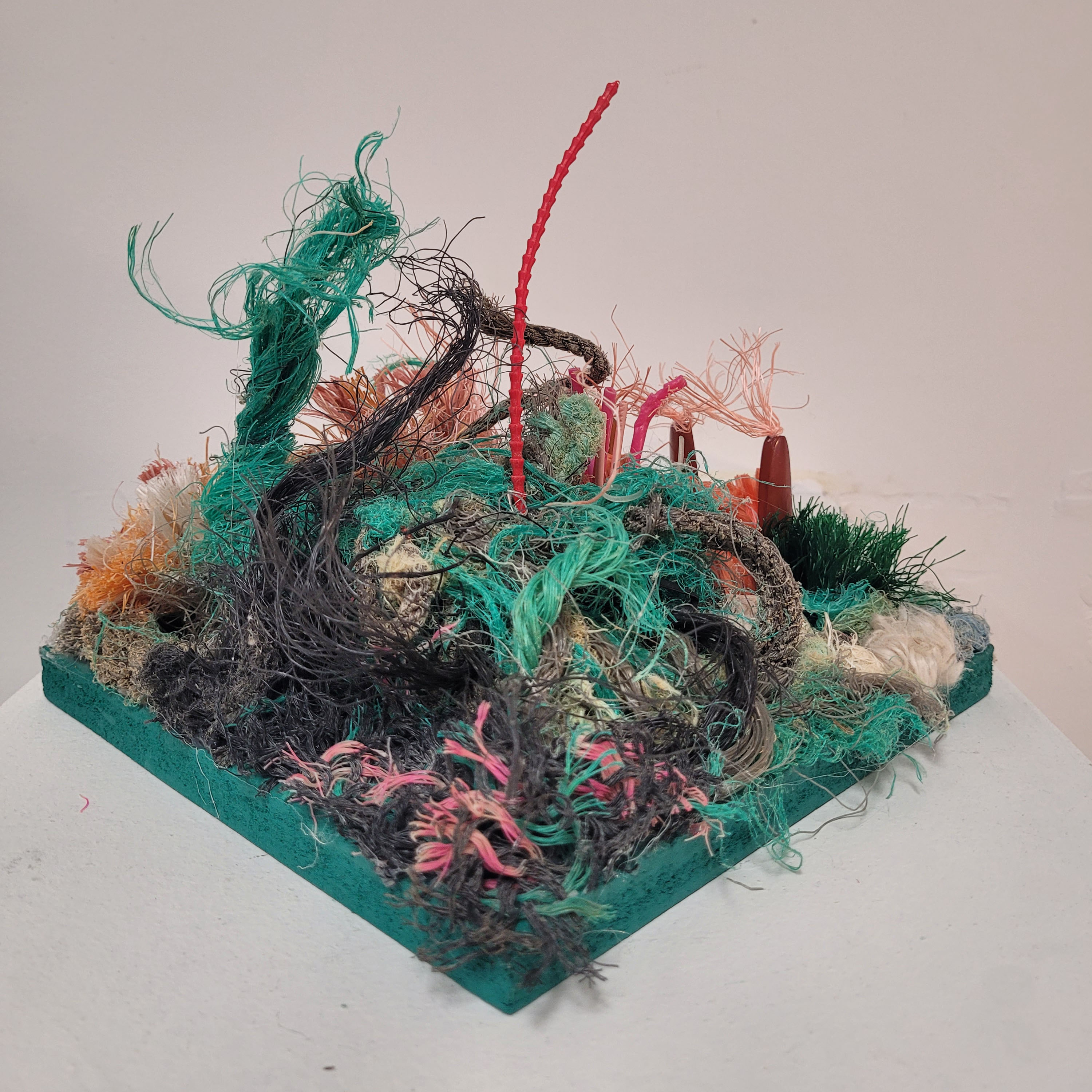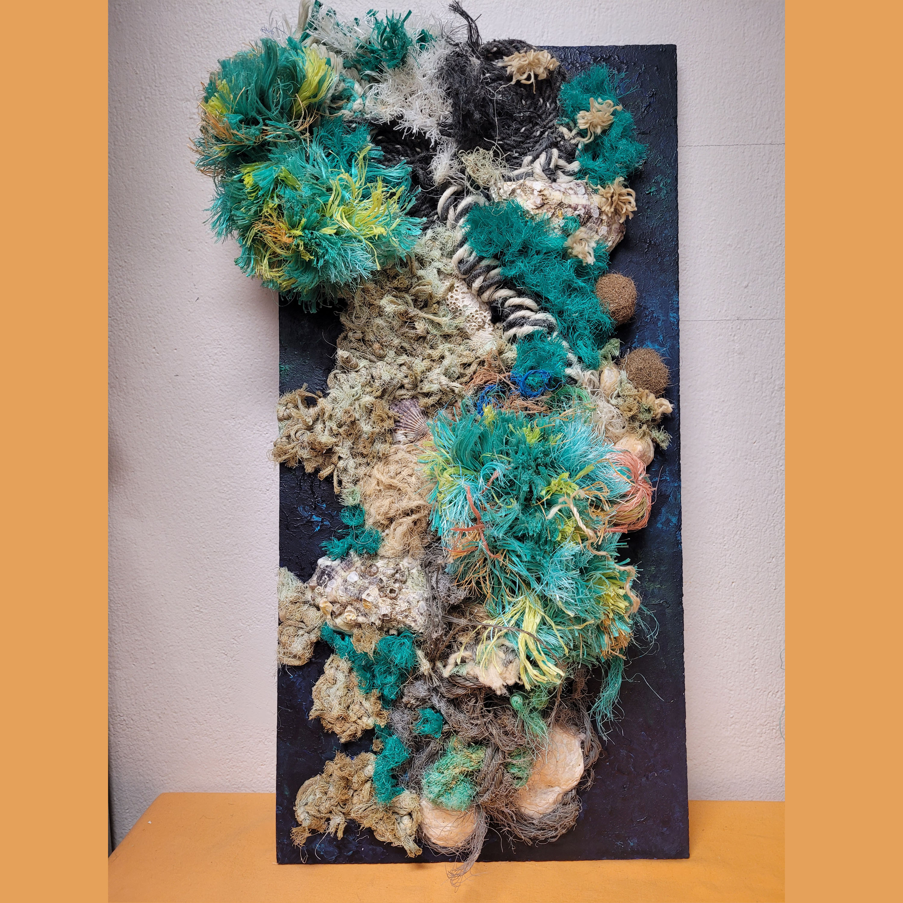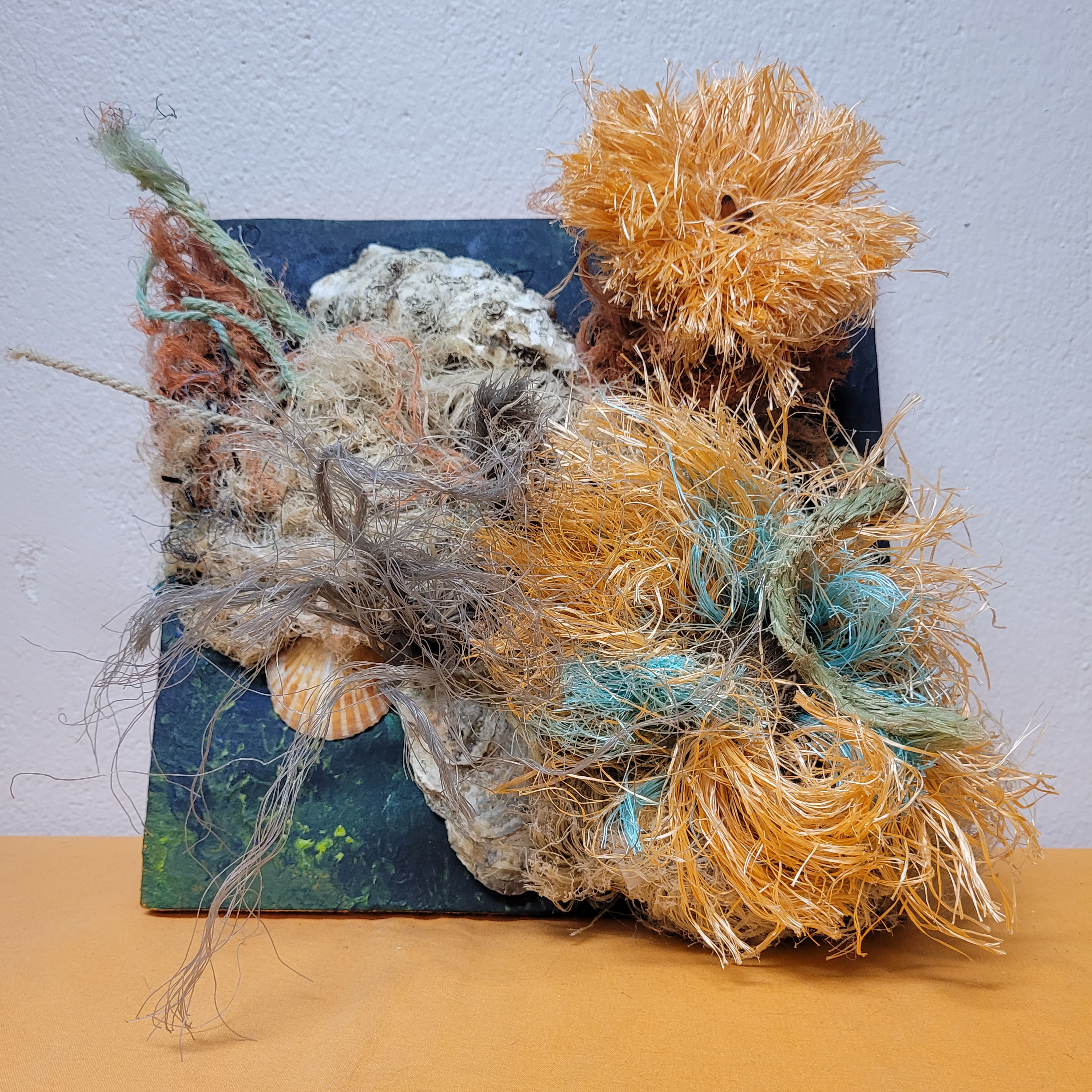 Dans les paysages maritimes que je compose, j’inscris la mémoire des détritus ramassés sur la plage au grès des marées successives. Chaque composition nous raconte une histoire, celle attachée à ces fragments accumulés, cordages, fils, morceaux de plastique ou encore filets de pêche.
