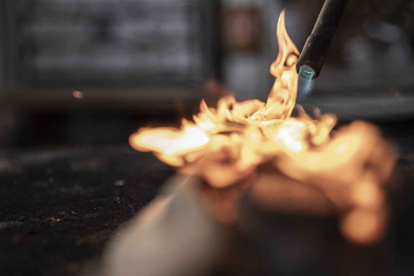 J’adore me laisser guider par des impulsions. La sculpture se construit au fur et à mesure. Je cherche toujours à créer de la transparence, des effets de lumière en jouant avec le noir du bois brûlé, les dégradés orangers du pin douglas, les reflets argentés ou bronze du métal.
