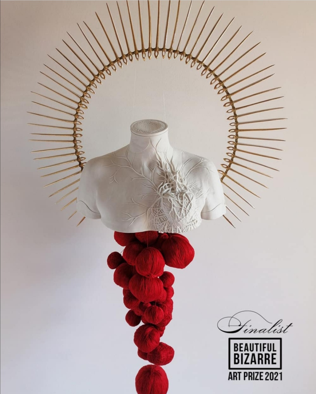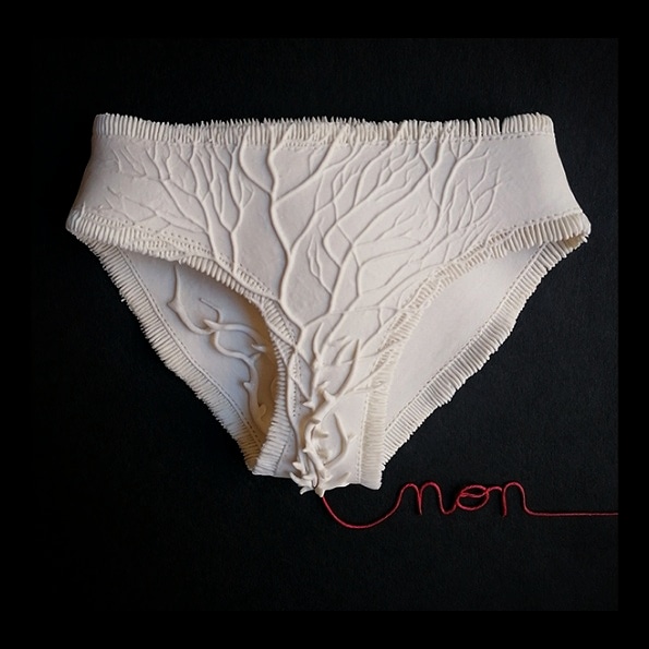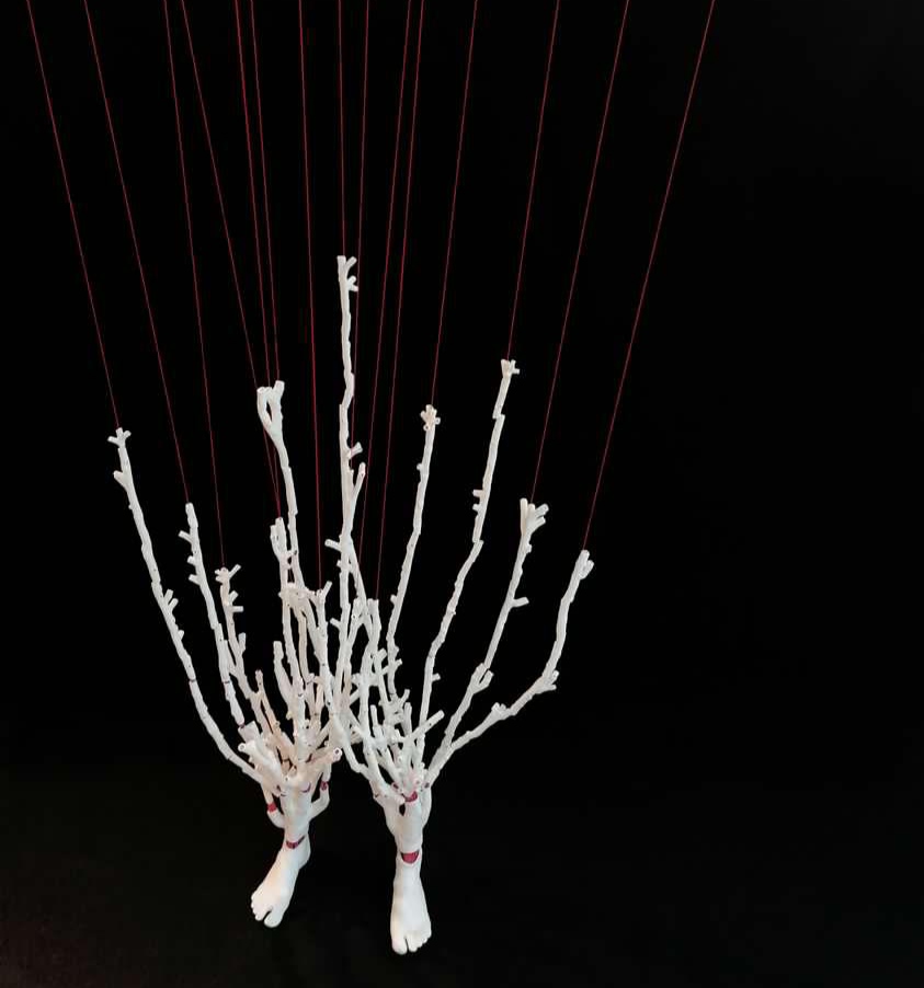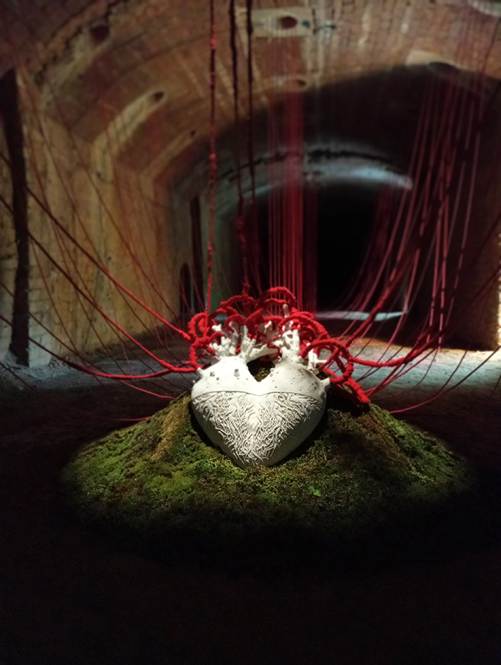 Juli About a une approche nourrit par les arts plastiques, la céramique, le théâtre et le bijou contemporain ; son parcours a été multiple… Ces expériences ont alimenté un questionnement lié au corps, à l’intimité, mais aussi à l’espace qui nous entoure. Ses travaux parlent du corps ; ils portent sur la limite entre le corps et le paysage ; la porosité du corps dans son environnement. Ce qui entre, ce qui sort, ce qui nourrit, ce qui blesse. Comment se raconte le lien que nous entretenons entre le dedans et le dehors. Entre soi et l’autre. Cela va toucher des notions d’intériorité et d’extériorité, de vulnérabilité, d’ambivalence.