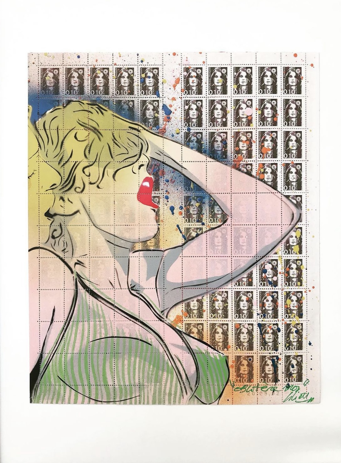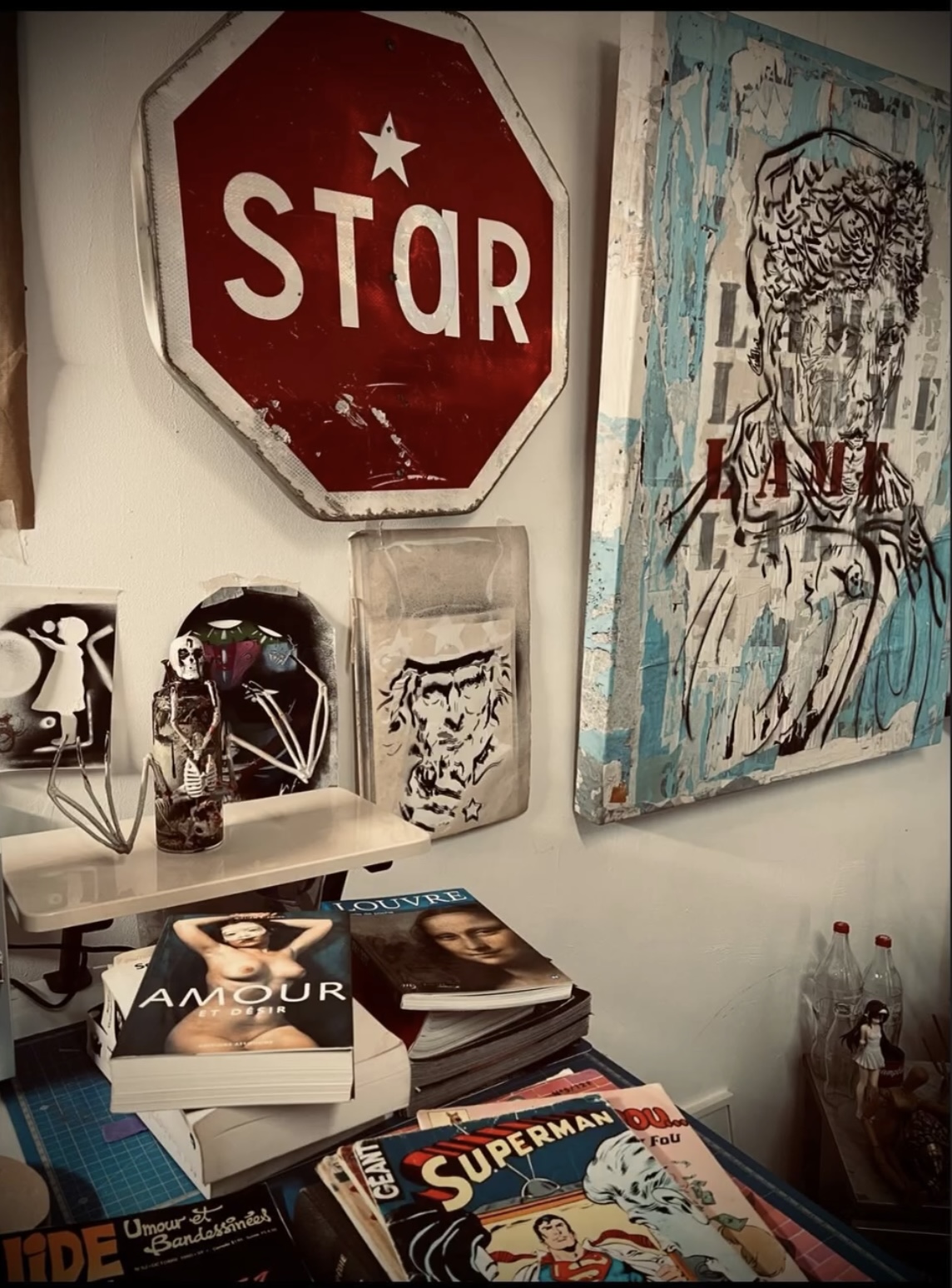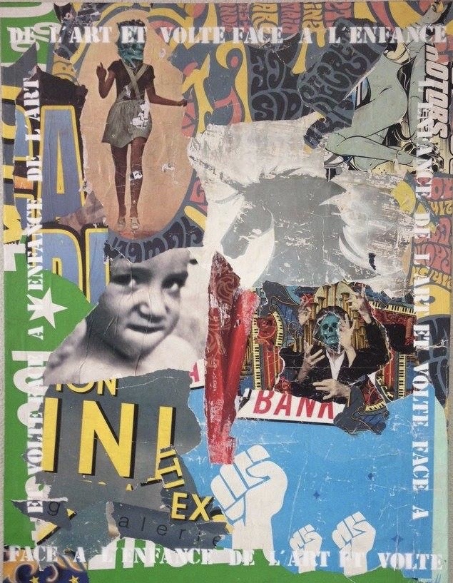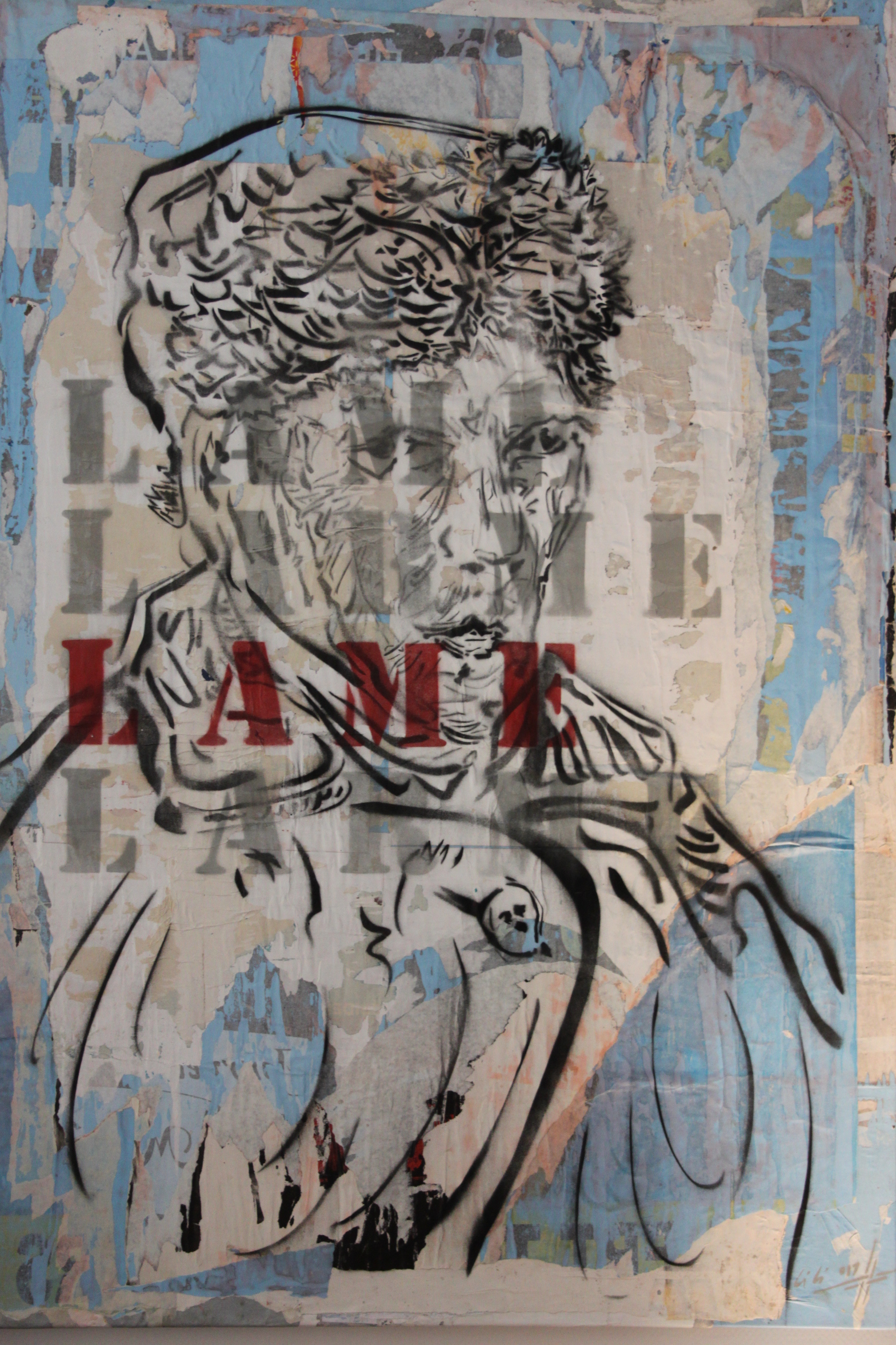 KIKI a une prédilection pour l’utilisation de supports et médiums issus de l’art urbain : il mêle le travail du pochoir, la mise en scène et le collage d’affiches arrachées, le détournement de mots façon slogan publicitaire, etc….. Autant de techniques et d’approches qui sont non seulement le reflet de l’influence culturelle et artistique de son époque adolescente, mais aussi celui de sa sensibilité et de son interprétation du monde actuel.