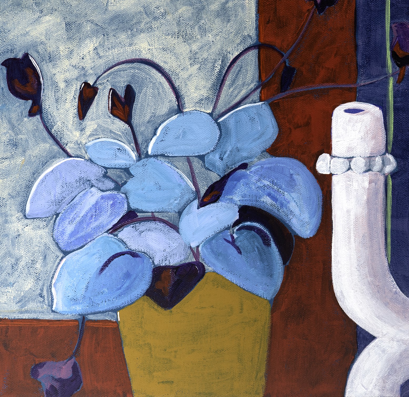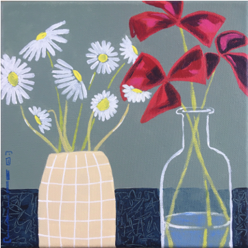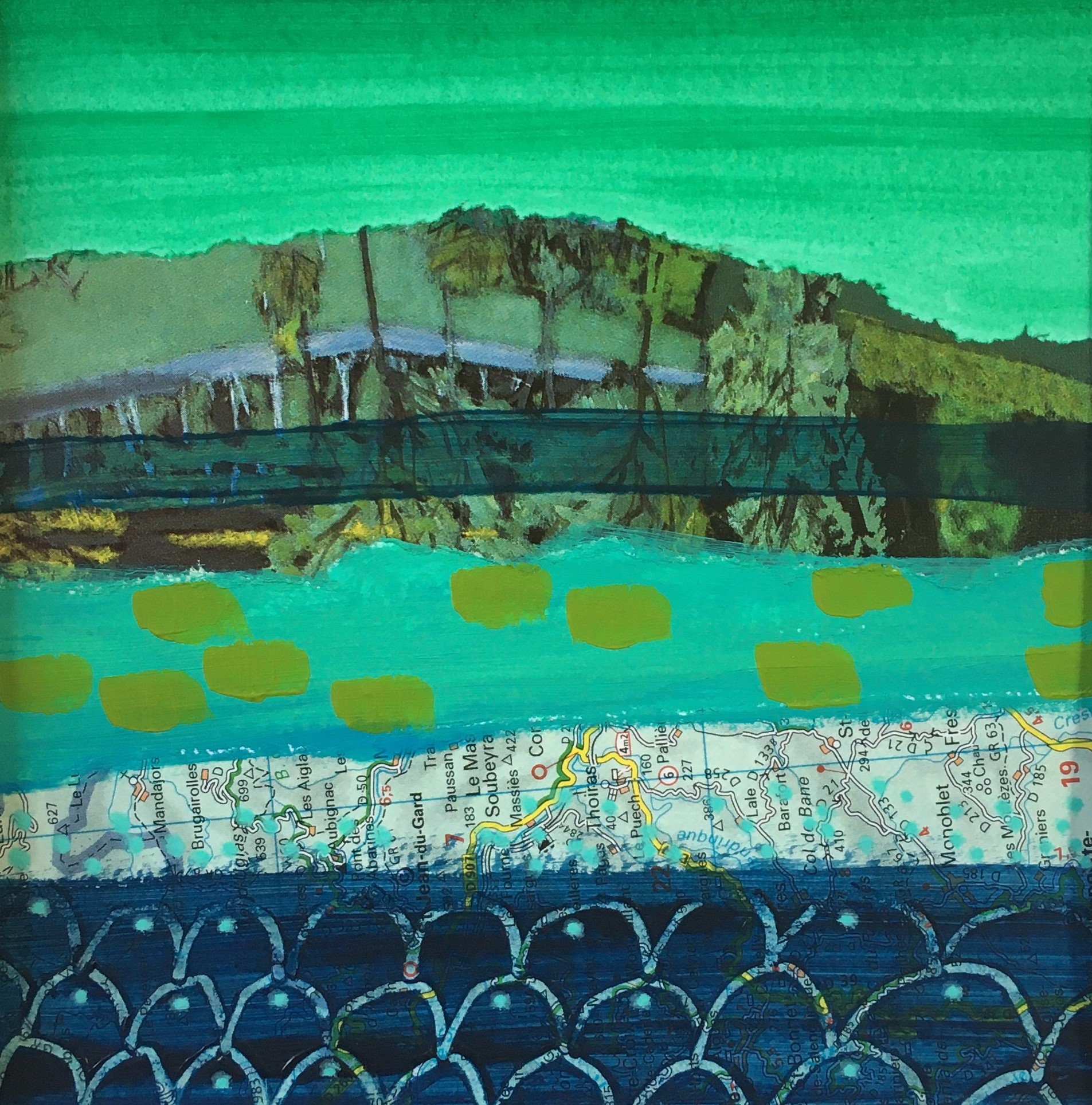 Je recherche les résonances, l’écho entre les couleurs, que ce soit dans mes peintures ou mes collages. Je souhaite créer une ambiance à la fois joyeuse et sereine, dans un style que l’on peut qualifier de figuratif naïf ou stylisé.