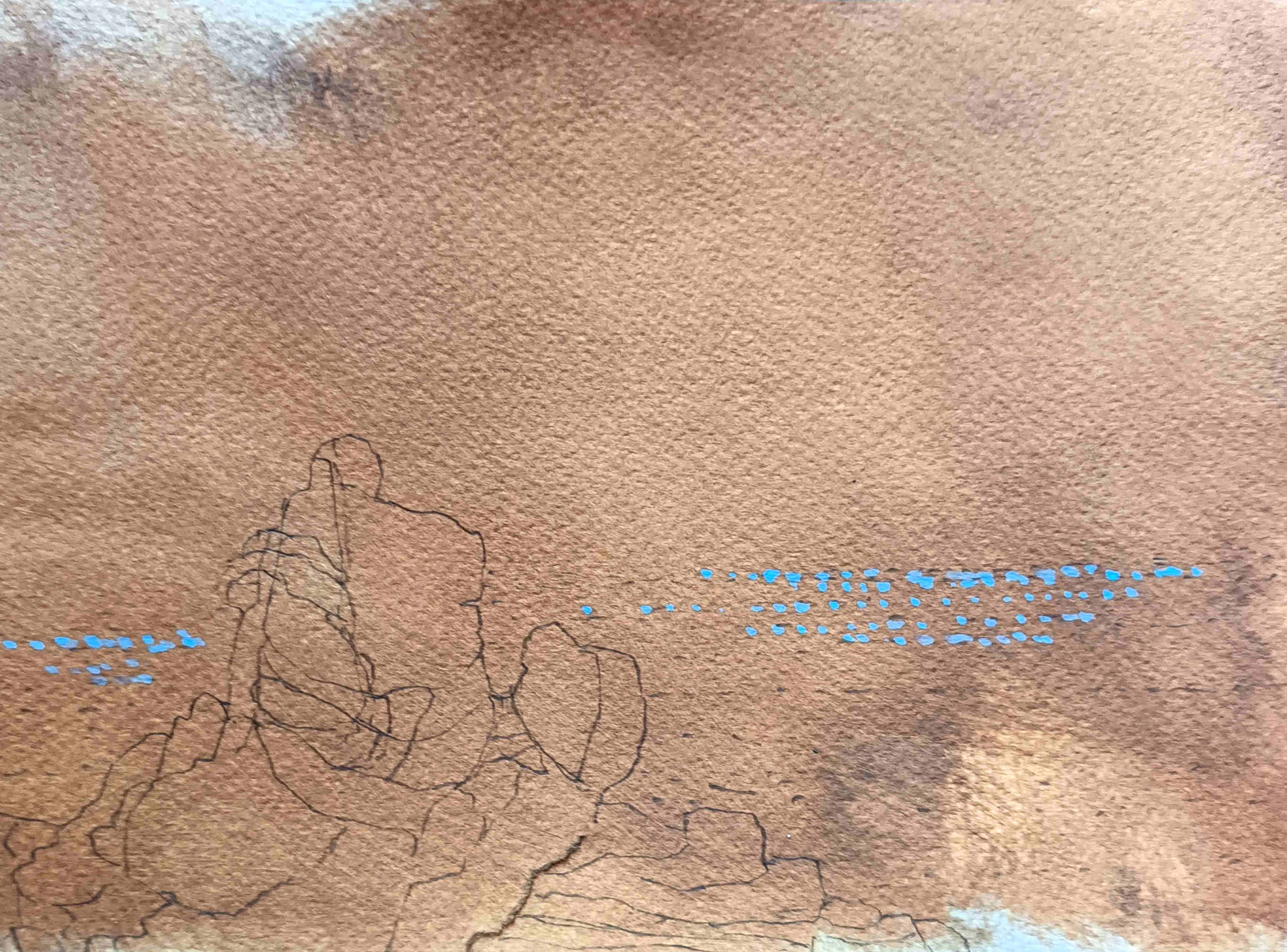 J’improvise à nouveau et à nouveau, chaque pièce est autonôme dans un ensemble. J’alterne support papier plat et support papier plié-déplié dont les leporello ravissent mon goût du voyage et de la transcription de ceux-ci.