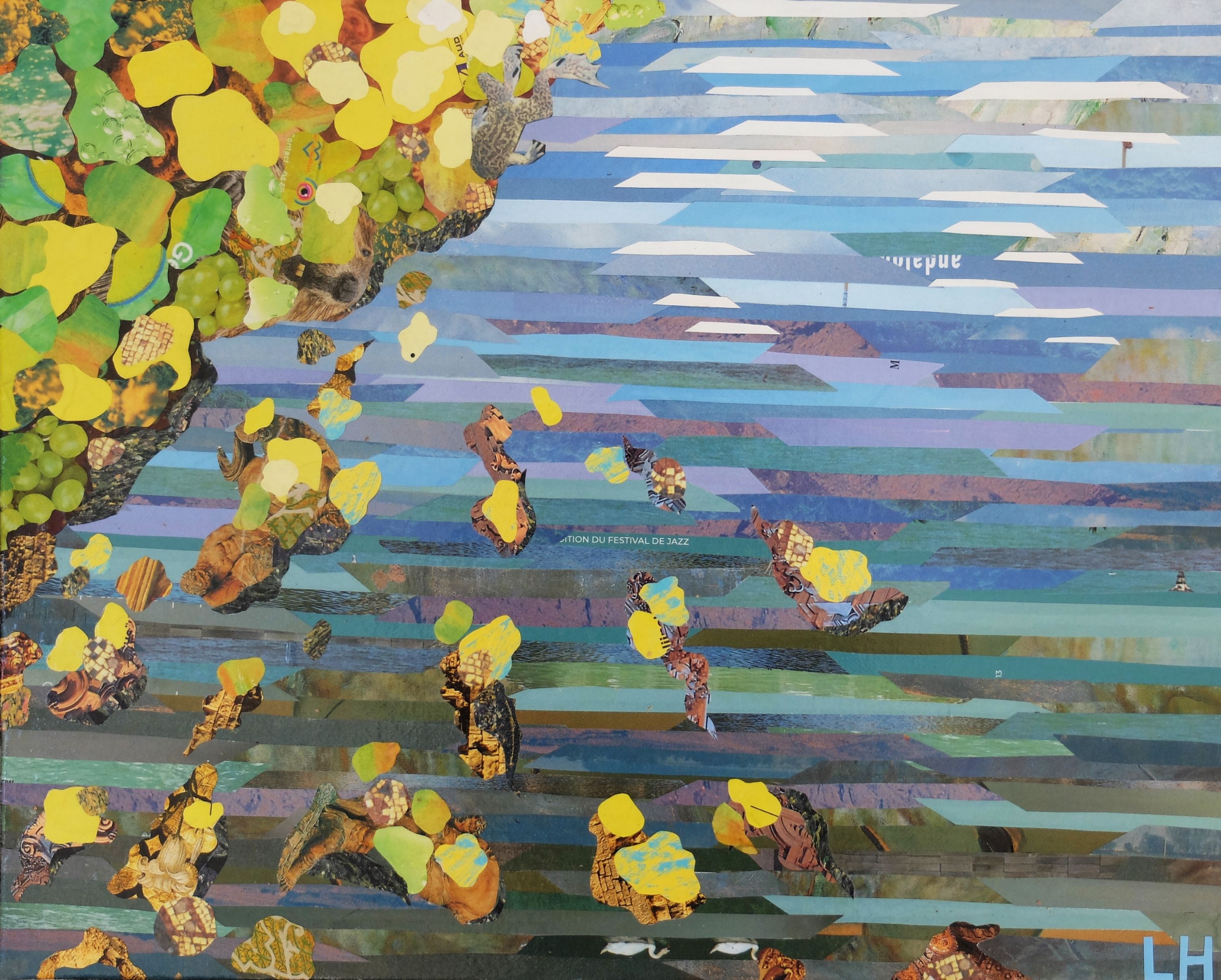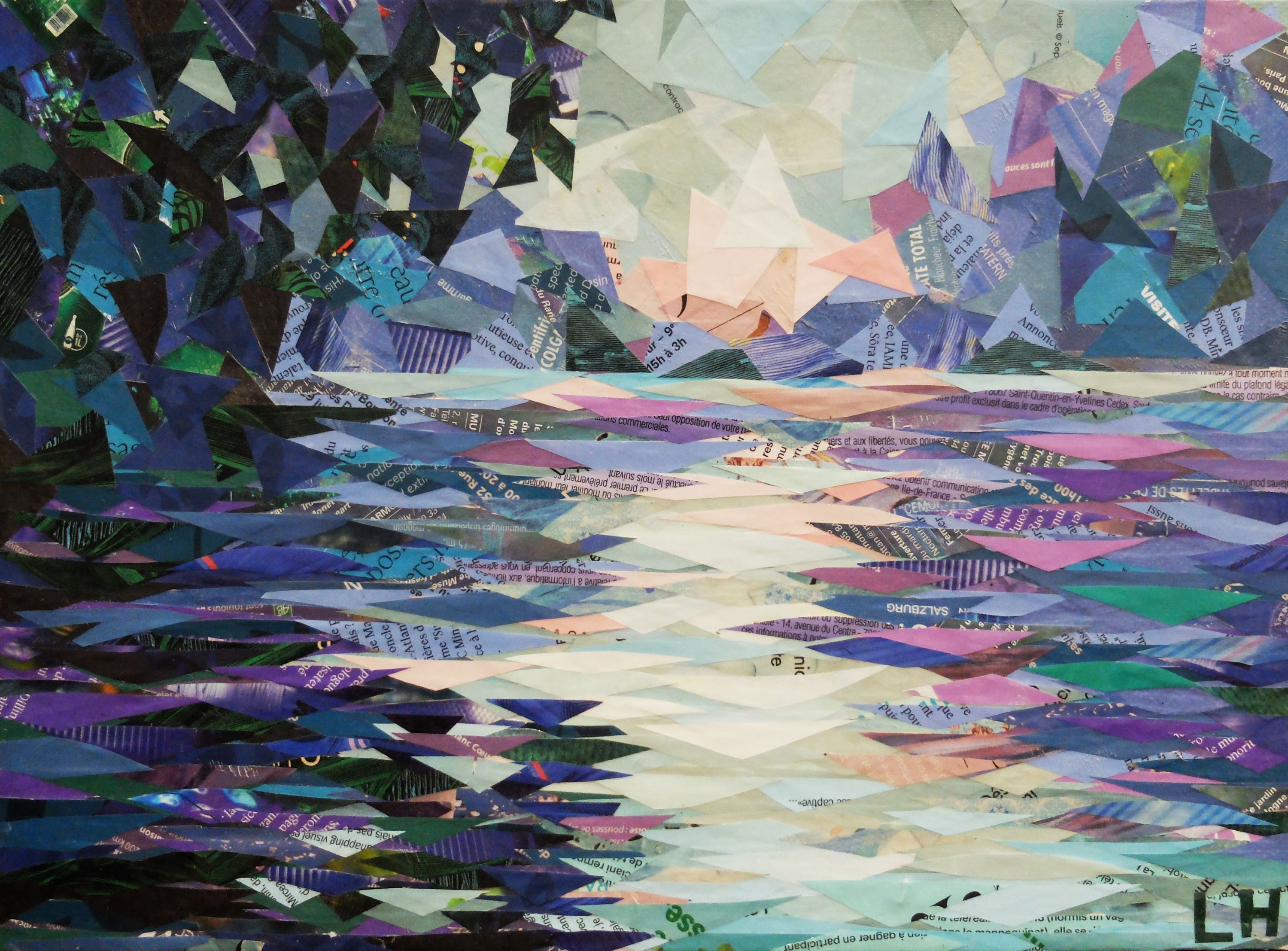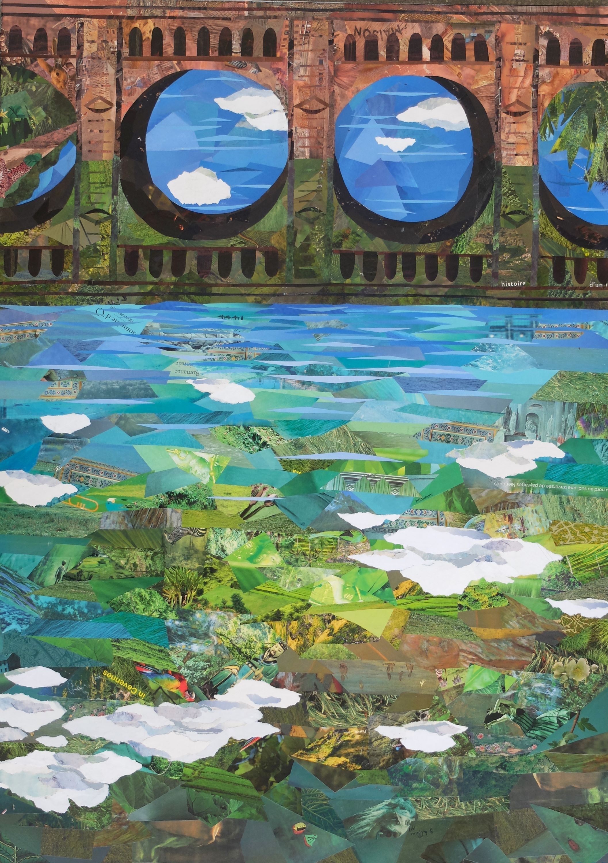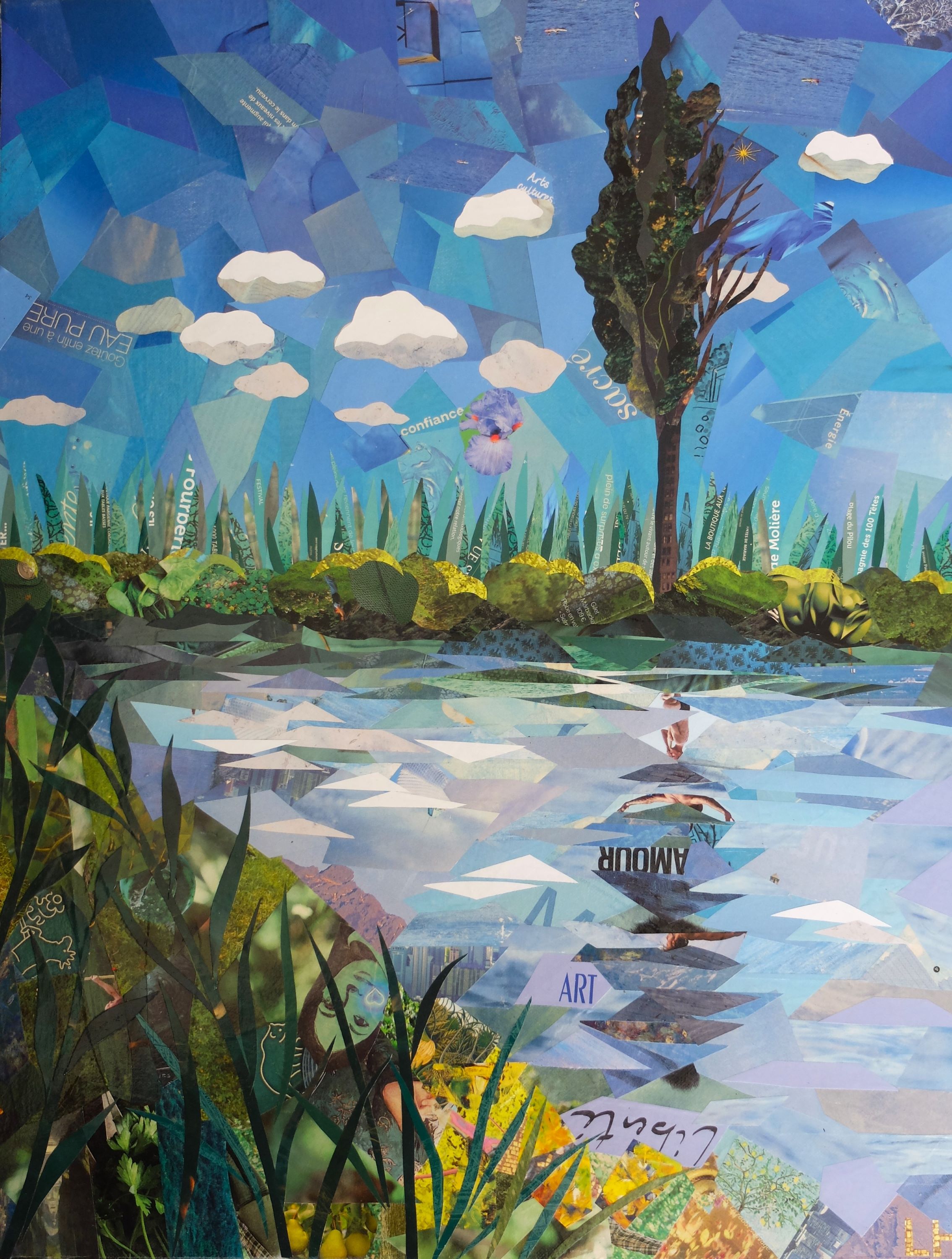 Le travail minutieux de recherche, découpage et collage me permet de m’immerger dans une sorte de méditation pour le plaisir de récréer paysages, nature et êtres à partir de ces petites particules de pub au départ plutôt destructeurs écologiques et d’humanité.