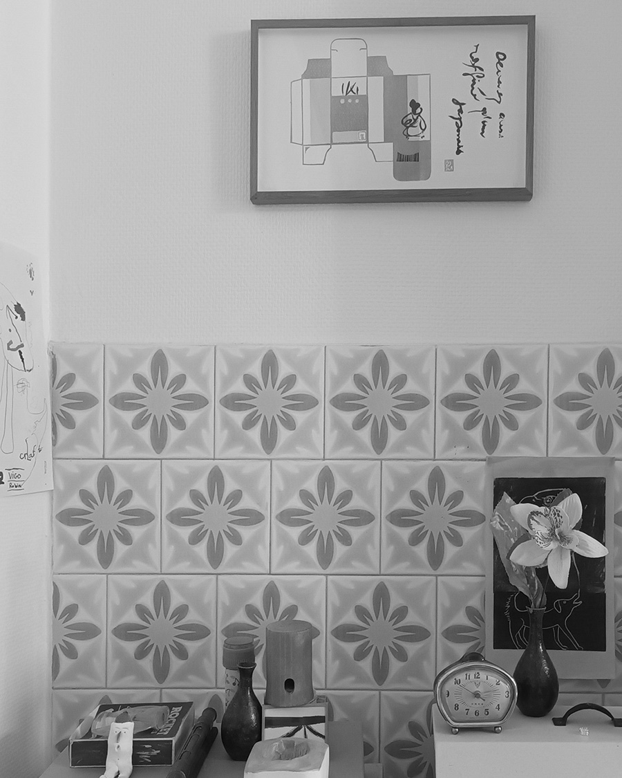 Je travaille avec des techniques traditionnelles. J’aime le papier, les matières et les surprises que les médiums imposent. J’aime l’efficacité du noir et blanc : la radicalité de l’encre noire, l’énergie d’un coup de pinceau et la beauté de la lumière qui compose l’espace blanc. J’aime aussi la générosité des couleurs et les mélanges d’outils. Je cultive un trait libre et spontané pour traduire des émotions comme la légèreté, la joie et une certaine poésie graphique, drôle et vivante.