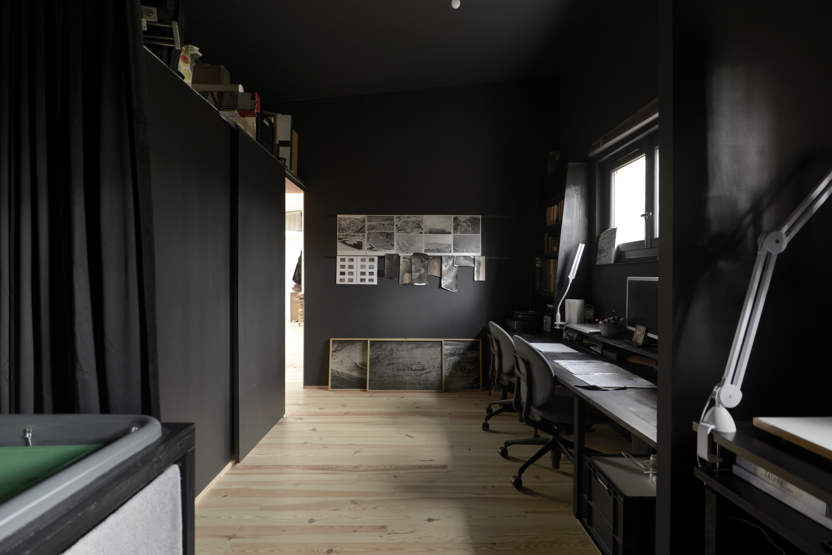 L’atelier / Laboratoire argentique de Leah Desmousseaux, artiste photographe, est installé au cœur des bois du village d’Escamps. Elle partage cet espace de travail avec Gaël Darras, artiste peintre et illustrateur.