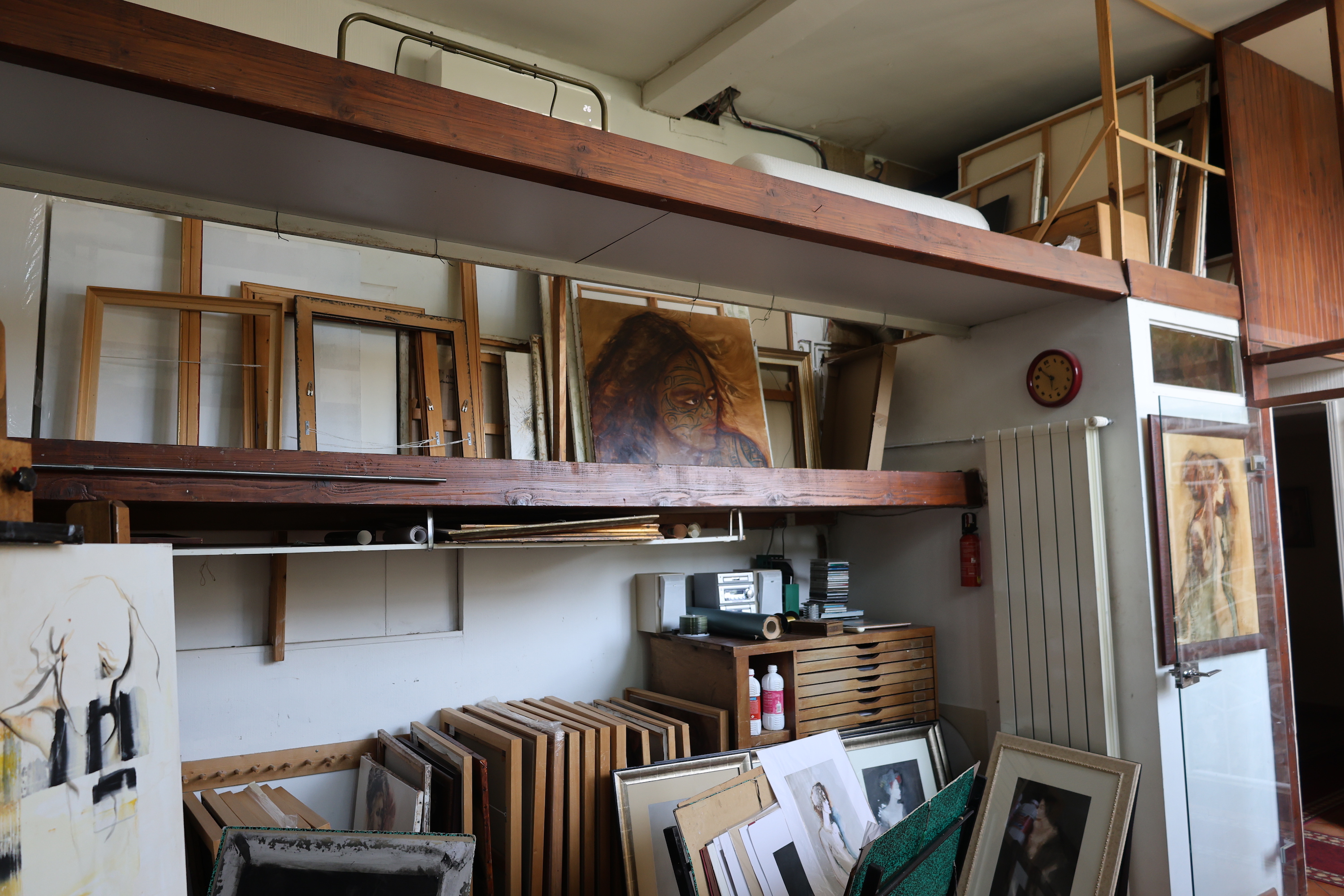 L’atelier de peinture est une pièce de 25m2 ouvrant par une paroi vitrée sur le jardin intérieur. il comprend un grand plan de travail et de présentation, et les chevalets pour l a peinture à l’huile. Les œuvres sont présentées dans des râteliers pour les toiles et dans des chevalets pour les œuvres sur papier sous pochette. suivant la météo , un affichage peut peut être organisé sur les murs de la cour d’entrée.