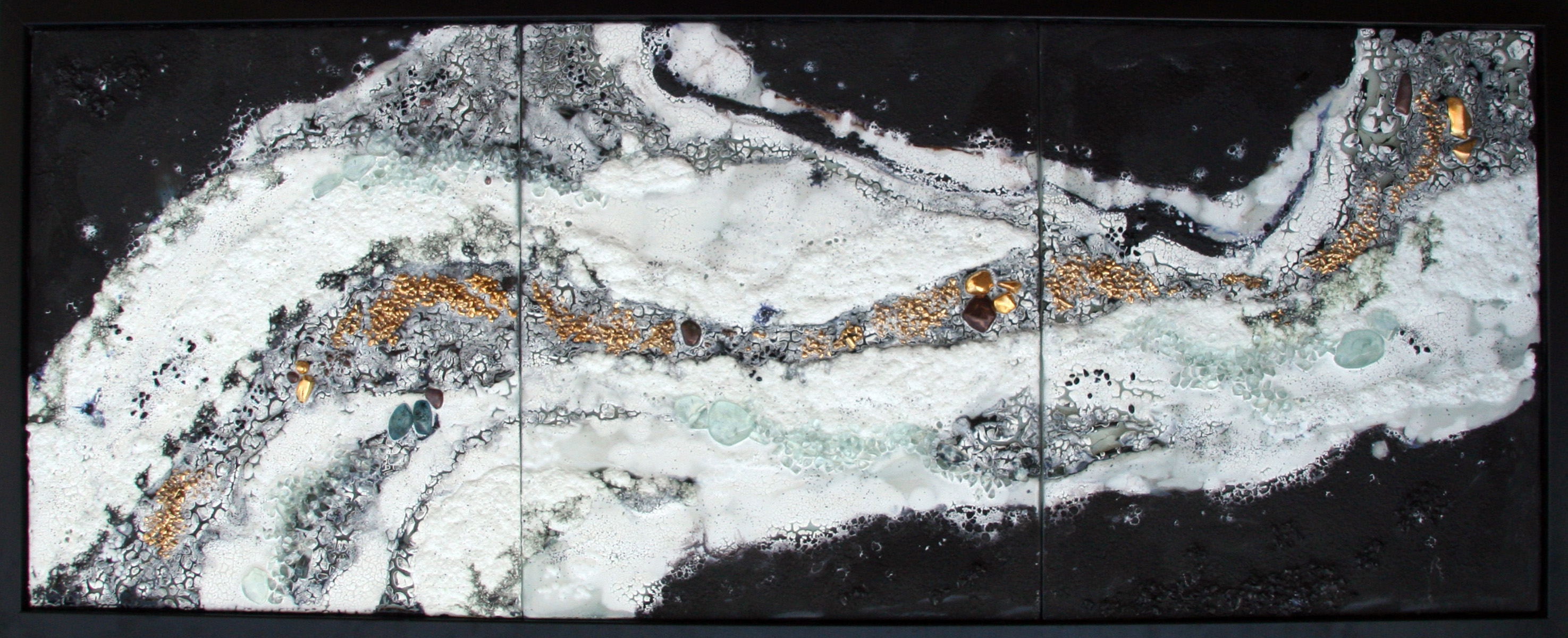 Je me sers des techniques du fusing et du thermoformage pour réaliser des panneaux de verre émaillé, qui peuvent être gravés et sérigraphiés avec des émaux. J’y inclus des métaux, or, argent, cuivre, et des pâtes de verre.